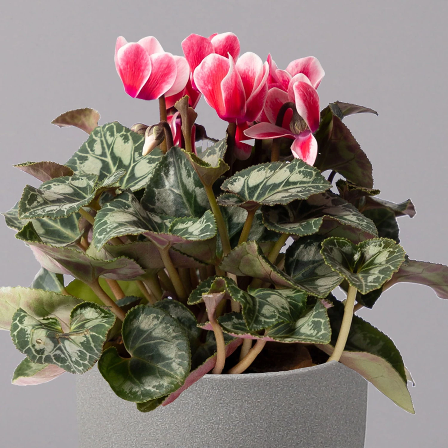 Das Zimmer-Alpenveilchen (Cyclamen persicum) ist eine der beliebtesten Blühpflanzen fürs Zimmer und erleuchtet mit seinen farbenfrohen Blüten die dunkle Herbst- und Winterzeit. Charakteristisch sind die herzförmigen Blätter, die mit silbernen Mustern versehen sind. Die Blätter der mehrjährigen Pflanze entspringen einer Knolle und bilden eine Rosette, aus der die Blüten an langen Stielen hervorgebracht werden. Das Alpenveilchen kann eine Höhe von bis zu 40 cm erreichen.