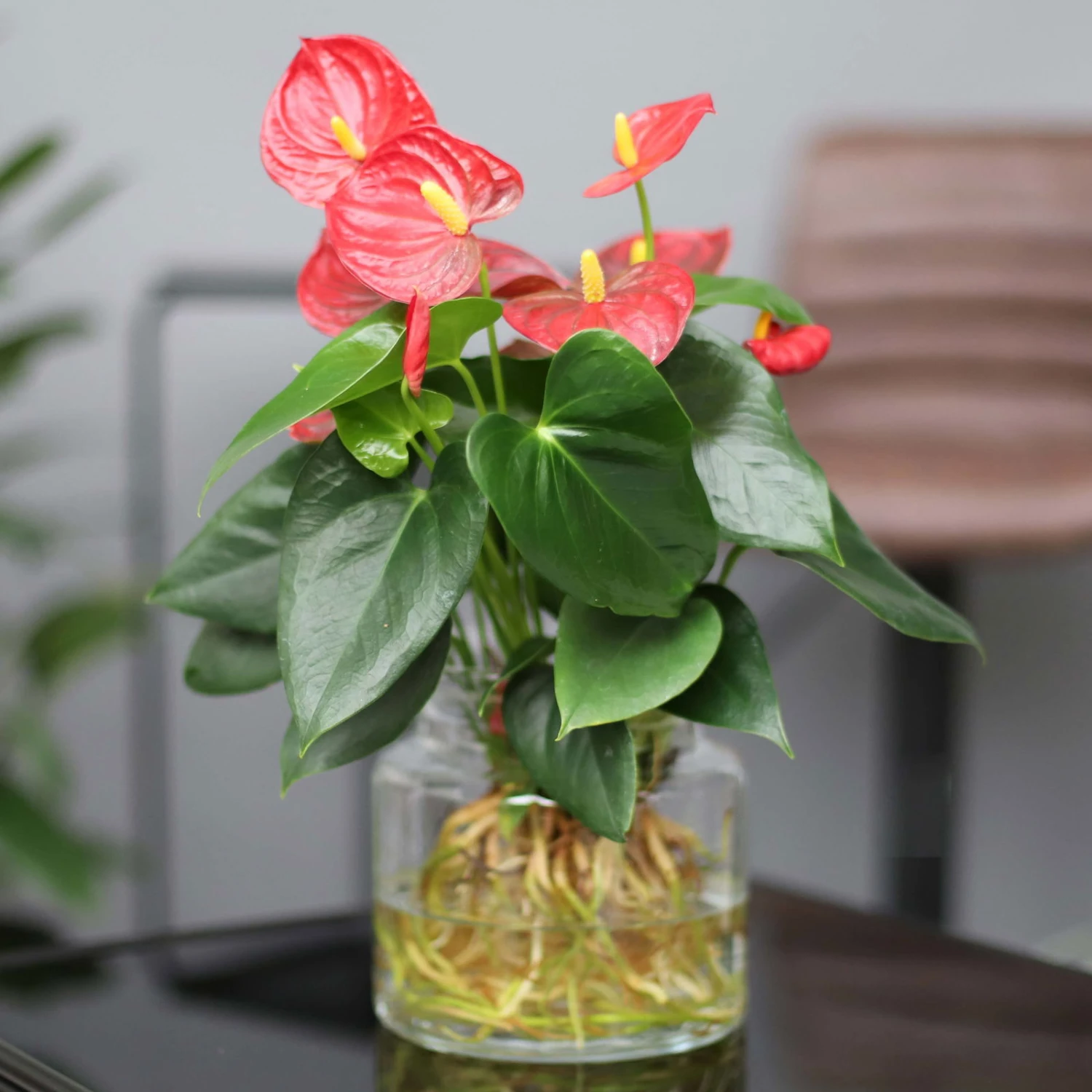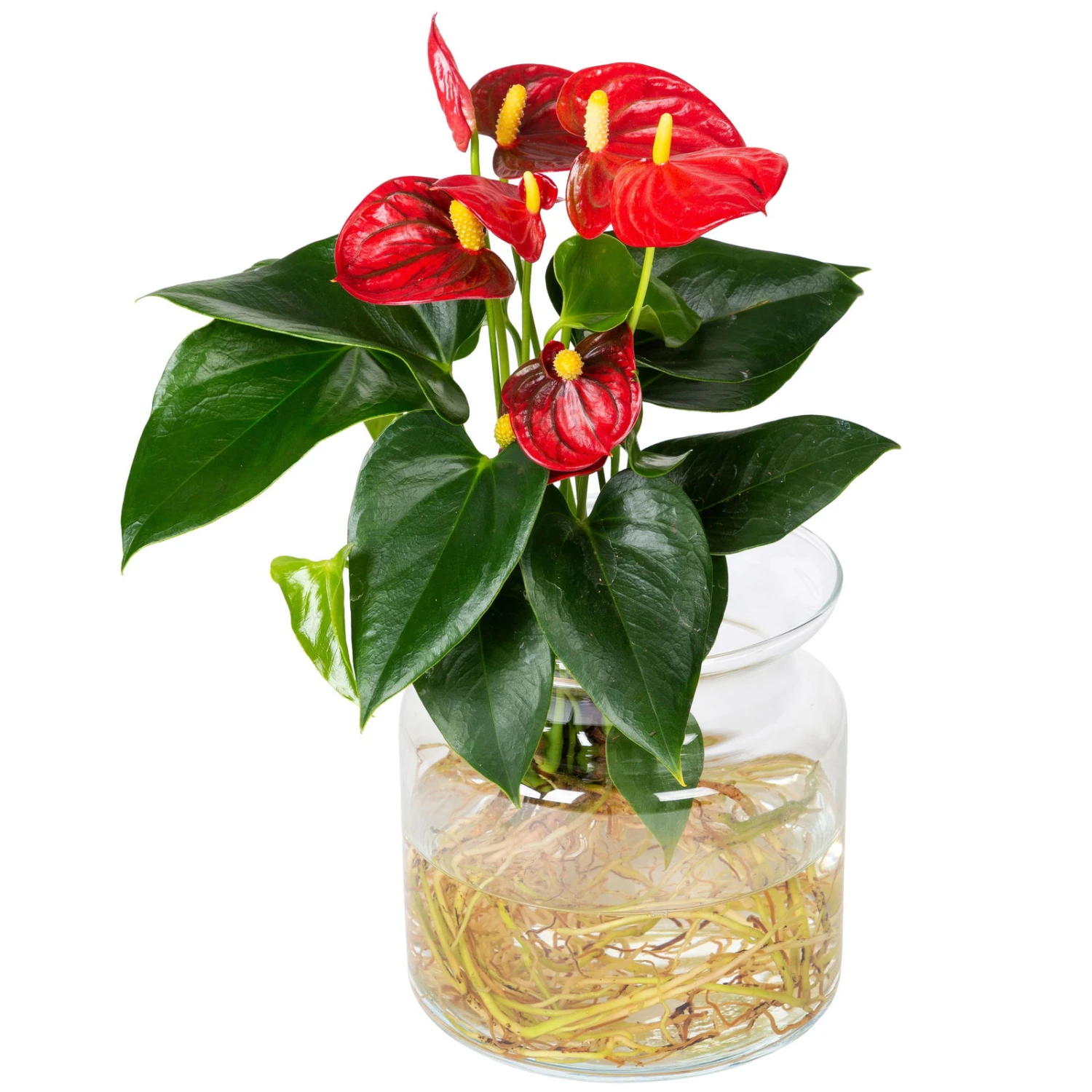 Mit dieser exklusiven Pflanzenschönheit holen Sie sich einen ganz besonderen Eyecatcher nach Hause: Diese exotische Flamingoblume, botanisch Anthurium genannt, kommt ganz ohne Erde aus und gedeiht ausschließlich in Wasser. In Kombination mit den roten, lackartigen Hüllblättern der Blüten und den glänzenden, lanzettlichen Blättern ziehen die freigelegten Wurzeln in der modernen Glasvase mit Sicherheit alle Blicke auf sich! Aber auch als Geschenk ist diese Rarität für jeden Zimmergärtner eine schöne Idee.