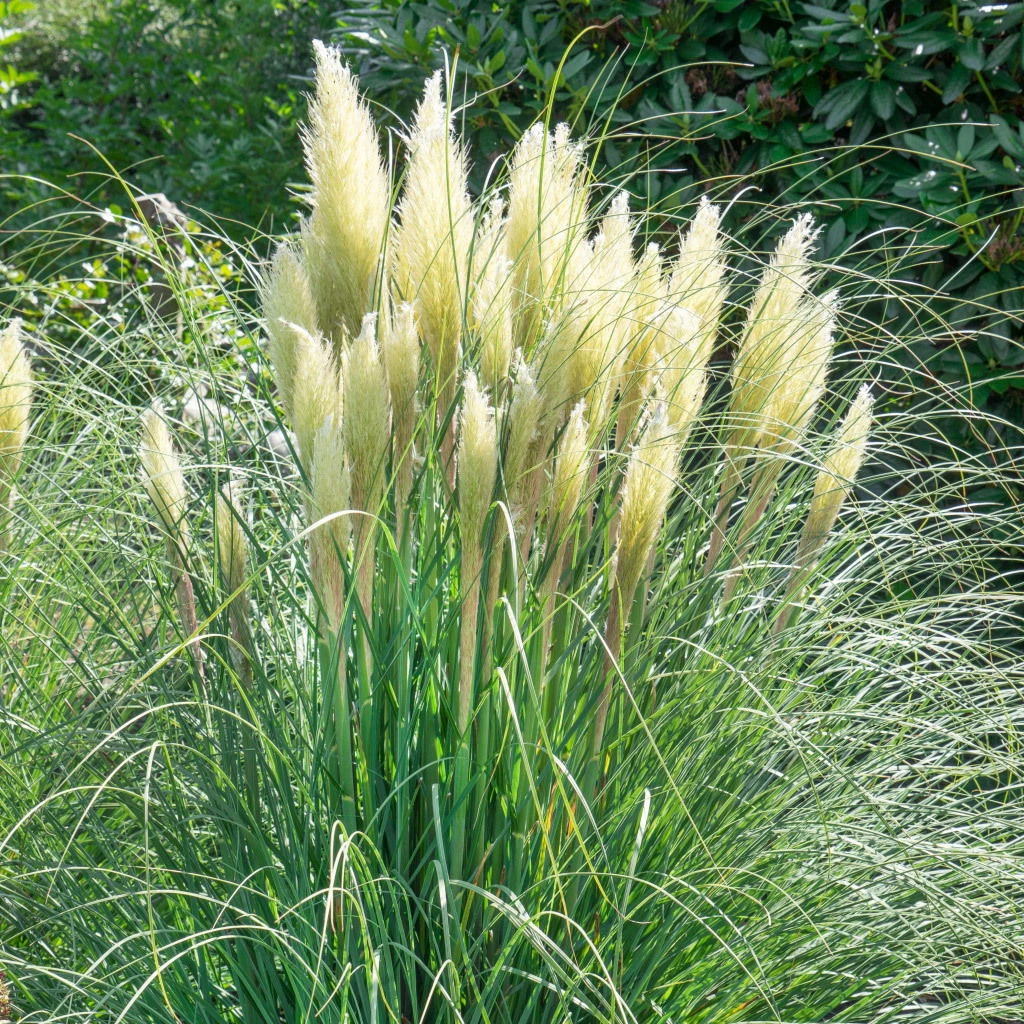 Das Kölle Bio Pampagras Cortaderia selloana ‚Senior‘ macht als Solitärgras und in Gruppen eine gleich gute Figur. Im Herbst wird Sie dieses bis zu 200 Zentimetern hohe Ziergras mit silberweißen Blütenwedeln begeistern. Das Pampagras fühlt sich an sonnigen Standorten wohl. Es braucht durchlässige, nährstoffreiche Böden. Zum Schutz der Pflanze vor Frost und Winternässe empfehlen wir, die Cortaderia selloana zusammenzubinden.