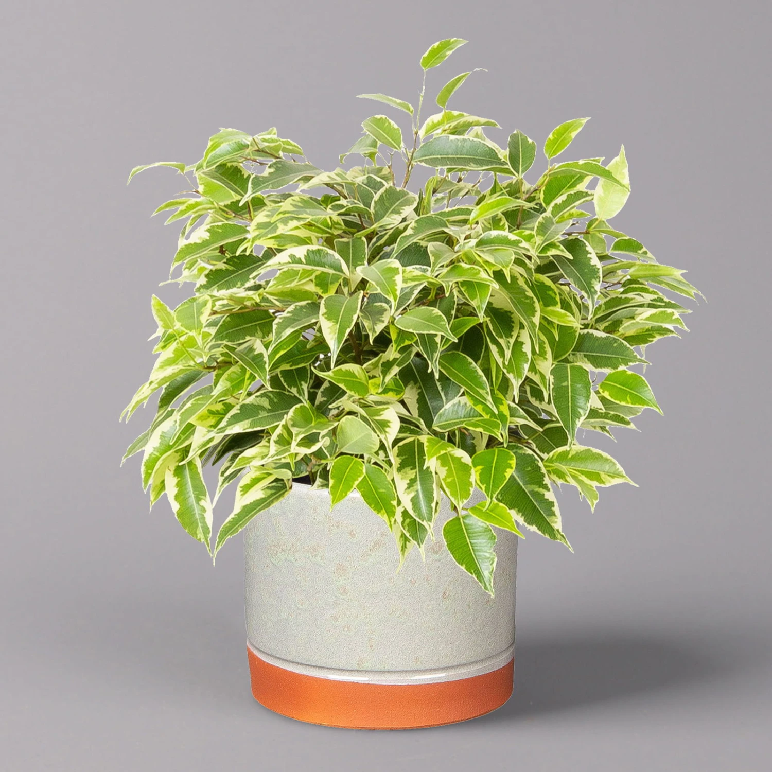 Die Birkenfeige (Ficus benjamina), bei uns auch unter den Namen ‚Benjamini‘ oder einfach nur ‚Ficus‘ bekannt, ist eine klassische Grünpflanze für Zimmer und Büro, die sich seit vielen Jahren großer Beliebtheit erfreut. Charakteristisch sind die elliptischen, zugespitzten Blätter, die je nach Art rein grün oder mit weißer bis gelber Panaschierung versehen sind. Die glänzenden, glatten Blätter sitzen an auffallend dünnen Zweigen, die an den Spitzen leicht überhängen. Die Sorte ‚Kinky‘ kann bei guter Pflege bis zu knapp 1 Meter hoch werden.