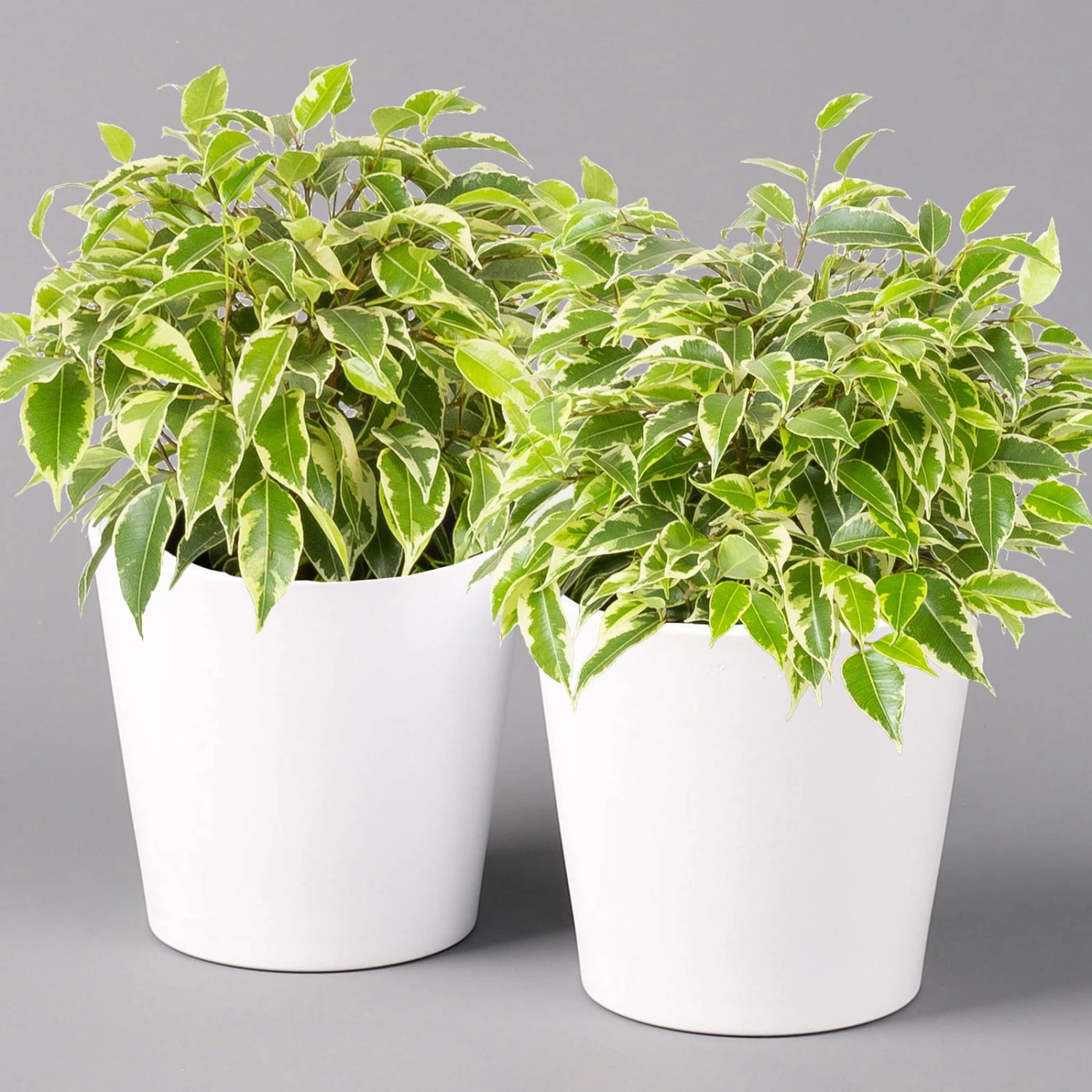 Die Birkenfeige (Ficus benjamina), bei uns auch unter den Namen ‚Benjamini‘ oder einfach nur ‚Ficus‘ bekannt, ist eine klassische Grünpflanze für Zimmer und Büro, die sich seit vielen Jahren großer Beliebtheit erfreut. Charakteristisch sind die elliptischen, zugespitzten Blätter, die je nach Art rein grün oder mit weißer bis gelber Panaschierung versehen sind. Die glänzenden, glatten Blätter sitzen an auffallend dünnen Zweigen, die an den Spitzen leicht überhängen. Die Sorte ‚Kinky‘ kann bei guter Pflege bis zu knapp 1 Meter hoch werden.