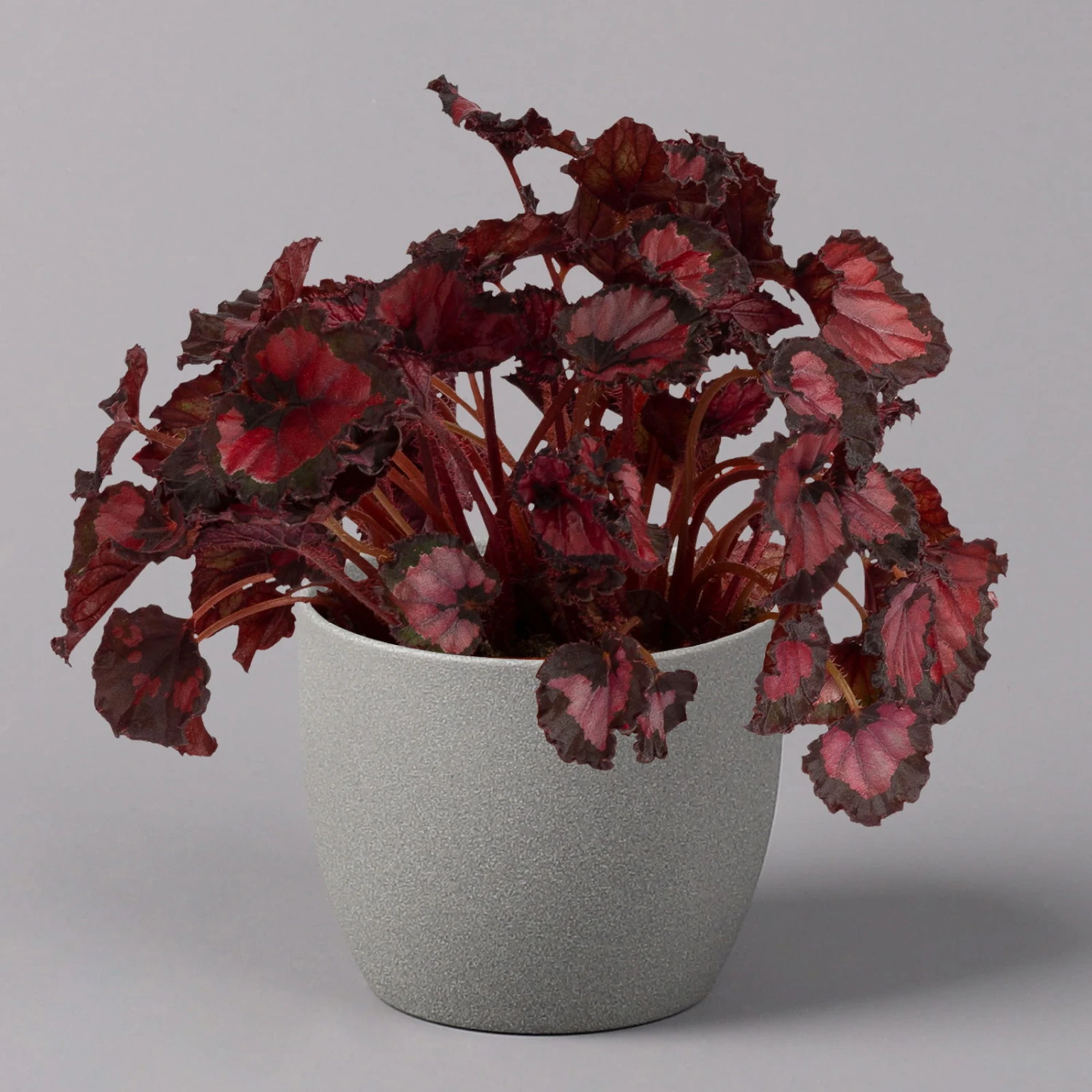 Die Blattbegonie (Begonia rex), auch als Rex-Begonie oder Königsbegonie bekannt, besticht mit ihren prächtig gemusterten, asymmetrisch geformten Blättern. Die immergrüne Staude wächst dicht buschig und kompakt und ist neben der Kultur im Topf auch hervorragend für Blumenampeln oder Schalen geeignet. Die Blattbegonie erreicht Höhen von bis zu 30 cm.