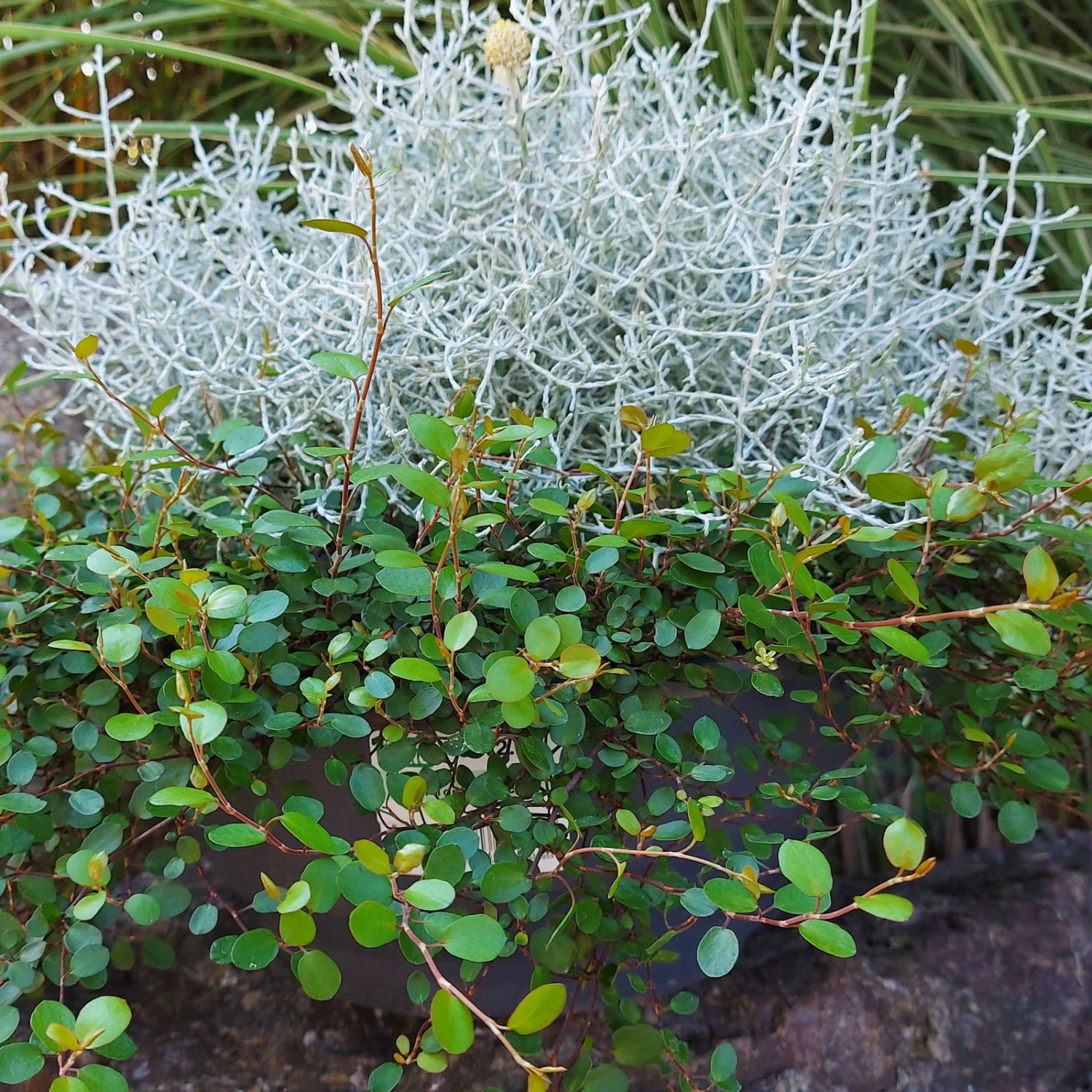 Als vielseitig kombinierbares Pflanzen-Duo in einem Topf eignet sich „Müca“ (Mühlenbeckia & Leucophyta syn. Calocephalus) zur Dekoration auf Terrasse, Balkon oder vor der Haustür. Auch als Grabschmuck ist dieser fertig gepflanzter Topf ein pflegeleichter Hingucker. Der aufrecht und buschig, korallenartig verzweigt wachsende Silberdraht (Leucophyta brownii syn. Calocephalus brownii) und die überhängend und bodendeckend wachsende Mühlenbeckie (Muehlenbeckia axillaris) komplettieren jedes Arrangement und harmonieren perfekt mit Knospenheide und anderen Herbstpflanzen. Wählen Sie für das Duo einen sonnigen bis halbschattigen Standort und vermeiden Sie Staunässe.