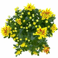 Die großen zweifarbigen Blüten sind aus Zungen- und Röhrenblüten zusammengesetzt. Die gestreiften Zungenblüten sind kranzförmig um die Mitte aus dunkelgelben Röhrenblüten angeordnet. Die Chrysantheme ‚Rainbow Rainbow Lake Worth“ blüht von August bis November in einem herrlichen Gelb und Rot und setzt damit schöne Akzente in Ihrem Zuhause.