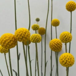 Die kleine, gelben Blüten der Craspedia stehen in einer Kugel auf einem langen Blütenstiel zusammen, daher der Name Trommelstöckchen. Die Craspedia blüht bis zum ersten Frost.