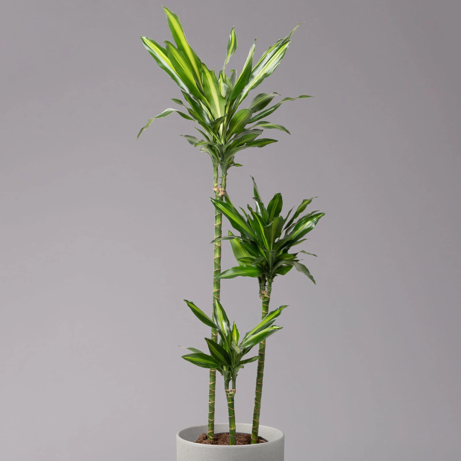 Dracaena fragrans ‚Cintho‘ fällt in erster Linie durch eine beeindruckende Blattzeichnung in fröhlichem Limettengrün auf. Diese Zimmerpflanze erhalten Sie in einem anspruchsvoll gestalteten 3er-Tuff mit verschieden hohen Stämmen für eine rundum effektvolle Optik. Je nach Wunsch können Sie die Dracaena ‚Cintho‘ als Solitär oder zusammen mit weiteren Tropengewächsen zur Begrünung von Ihrem Wohnzimmer, Office oder Ihrer Küche einsetzen. Ihre Dracaena ist dabei weit mehr als nur eine immergrüne Zierde, sondern auch ein zuverlässiger Luftfilter. Die Drachenbäume reduzieren die Mengen an gesundheitsschädlichen Substanzen wie Benzol und Formaldehyd und reichern dafür die Luft mit lebensspendendem Sauerstoff an. Vorteilhaft ist ein geringer Pflegeaufwand, denn eine Dracaena ist nur relativ selten zu gießen und gedeiht sowohl in hellen als auch in halbschattigen Lagen.