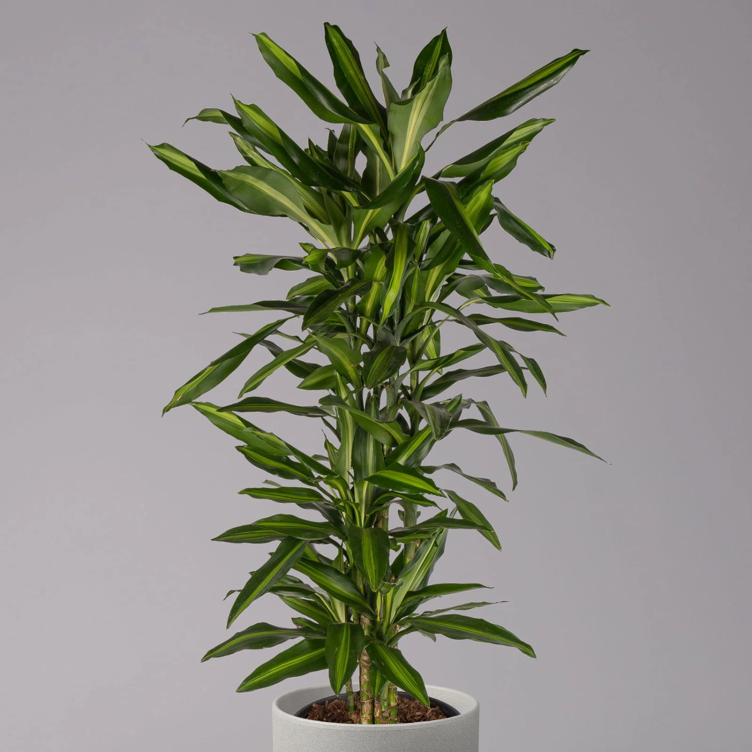 Die Dracaena fragrans ‚Cintho‘ ist eine beliebte Blattschmuckpflanze, die mit einer effektvollen Kombination von grünen und gelben Streifen sowie mit verzweigtem Wuchs besticht. Der Drachenbaum ist ein anspruchsloser Klassiker unter den Zimmerpflanzen und verzeiht Ihnen einige Pflegefehler. Unregelmäßige und eher sparsame Wassergaben stellen für die Dracaena fragrans ‚Cintho‘ kein Problem dar. Für eine gute Drainage ist jedoch unbedingt zu sorgen, außerdem darf der Wurzelballen nicht vollständig austrocknen. Ein halbschattiger Standort ohne direkte Sonne ist eine wichtige Voraussetzung für das Gedeihen einer Dracaena. Die Drachenbäume reichern die Raumluft mit Sauerstoff an und binden außerdem solche Schadstoffe für Benzole oder Toluole. Diese Raumklimapflanzen sind daher unter anderem für Büros und Küchen die richtige Wahl.
