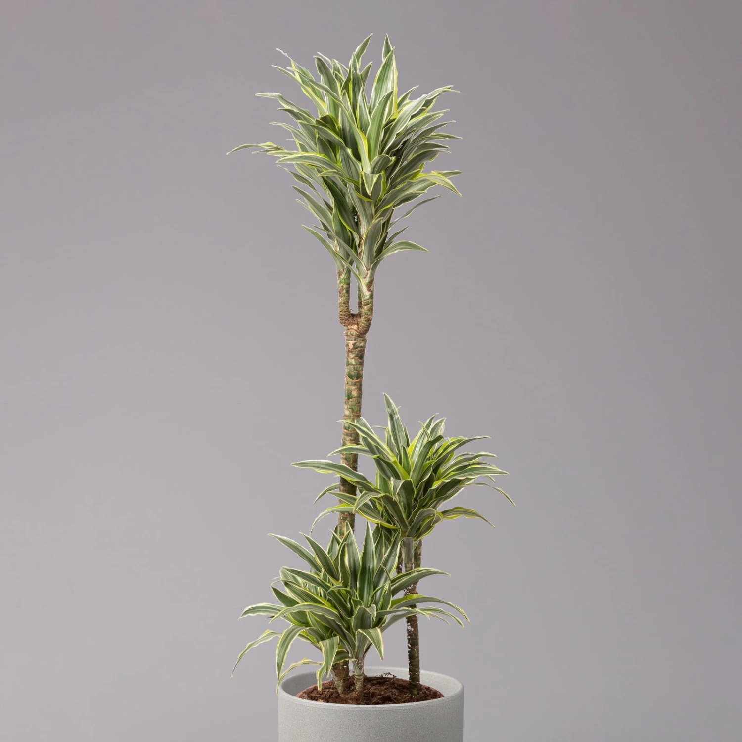 Der exotische Drachenbaum, die Dracaena ‚Compacta Surprise‘, besticht durch eine kompakte Wuchsform sowie durch originelle lanzettförmige Blätter mit leuchtend-gelber Zeichnung. Die Drachenbäume erreichen bei richtiger Pflege Wuchshöhen bis zu 1,5 – 2 Metern und entwickeln sich sehr harmonisch. Diese Zierpflanzen erweisen sich als anspruchslos und leben lange. Stellen Sie Ihre Dracaena Compacta Surprise dort auf, wo das Gewächs genug Licht bekommt, aber vor direkter Sonne die meiste Zeit geschützt bleibt. Das Substrat ist leicht angefeuchtet zu halten, Staunässe vertragen diese Spargelgewächse jedoch nicht. Für die Nährstoffversorgung dürfen Sie einen Flüssigdünger für Grünpflanzen verwenden. Übrigens dürfen Sie Drachenbäume kaufen, um für eine bessere Luftqualität zu sorgen, denn diese Gewächse sind imstande, mehrere Schadstoffe zu binden.