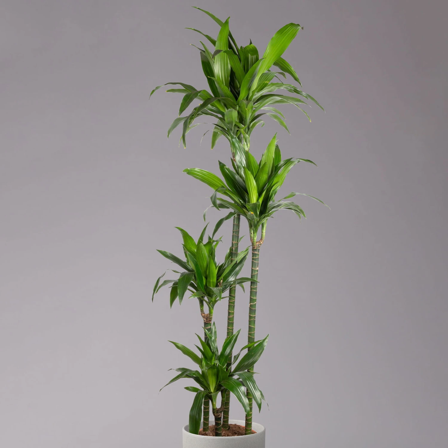 Sie erhalten die Dracaena fragrans ‚Janet Craig‘ in einem anspruchsvoll gestalteten Vierer-Tuff mit unterschiedlich hohen Stämmen. Ihr Drachenbaum besticht mit kraftvollem Grün seiner lanzettförmigen Blätter und eignet sich gleich gut zur Begrünung von Wohnräumen oder Büros. Drachenbäume gehören zu den beliebten Raumklimapflanzen, da dieses Gewächs mehrere Schadstoffe der Luft entzieht und außerdem große Mengen an Sauerstoff synthetisiert. Genau deshalb ist ein Drachenbaum für Raucherwohnungen, Küchen oder auch fürs Büro immer die richtige Lösung. Die Dracaena fragrans ‚Janet Craig‘ fühlt sich in halbschattigen Lagen wohl und benötigt nicht allzu viel Wasser. Sie dürfen das Substrat gerne antrocknen lassen, außerdem ist unbedingt für eine ordentliche Drainage zu sorgen.