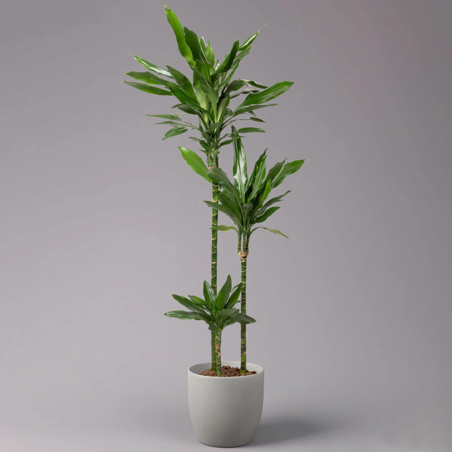 In einem aufwendig gestalteten Tuff mit drei unterschiedlich hohen Stämmen sieht die Dracaena ‚Janet Lind‘ anmutig aus und setzt tropische Akzente im Wohnraum oder Büro. Drachenbäume sind pflegeleichte Zimmerpflanzen, die sich an einem hellen oder halbschattigen Standort wohlfühlen und nur wenig Wasser benötigen. Zugleich ist Ihre Dracaena ‚Janet Lind‘ wärmeliebend und gedeiht am besten in beheizten Räumen ohne Zugluft. Die Drachenbäume sind nicht nur eine grüne Zierde, sondern auch zuverlässige Sauerstofflieferanten und effiziente Luftfilter. Diese erstaunlichen Gewächse vermögen es nämlich, Benzol und Formaldehyd dauerhaft zu binden.