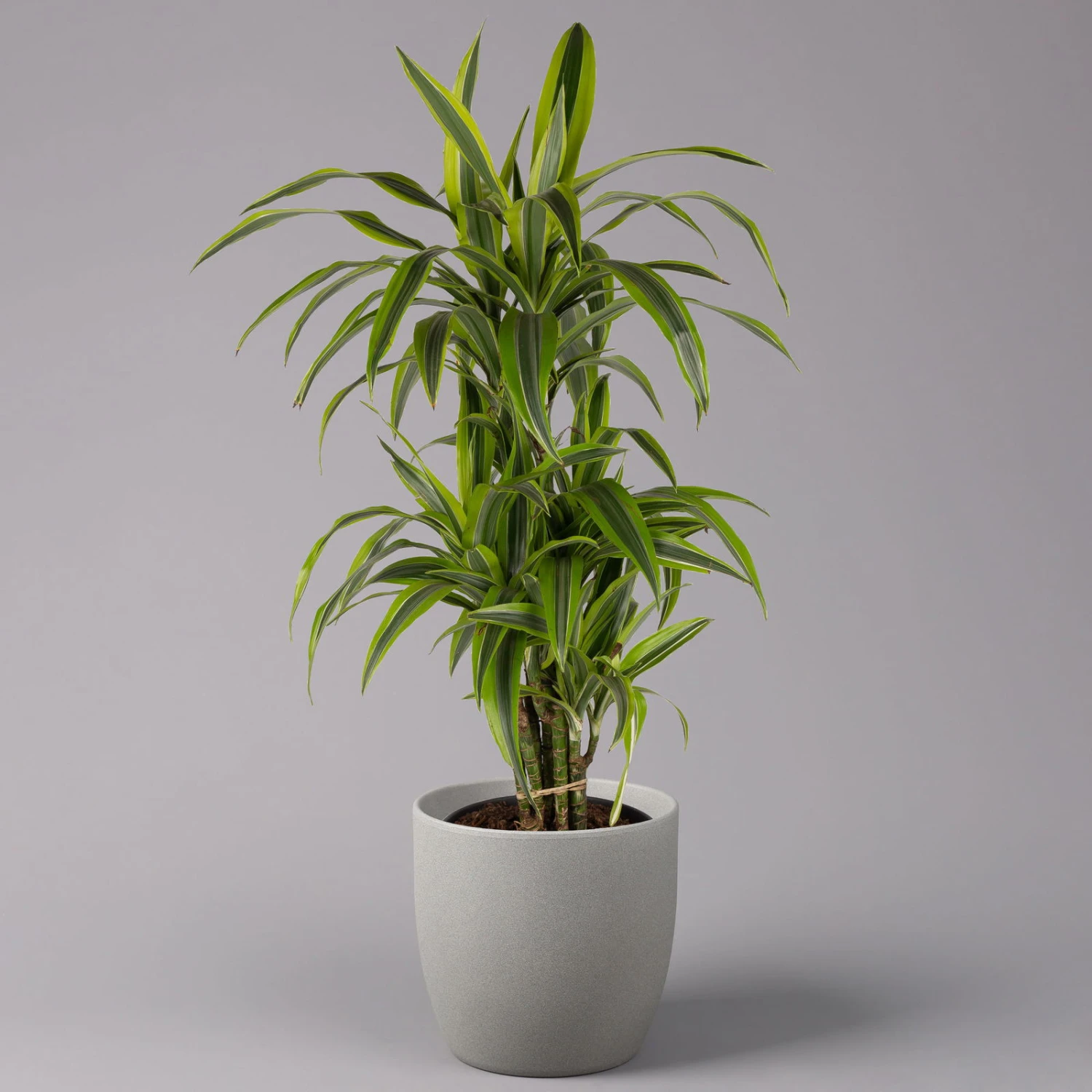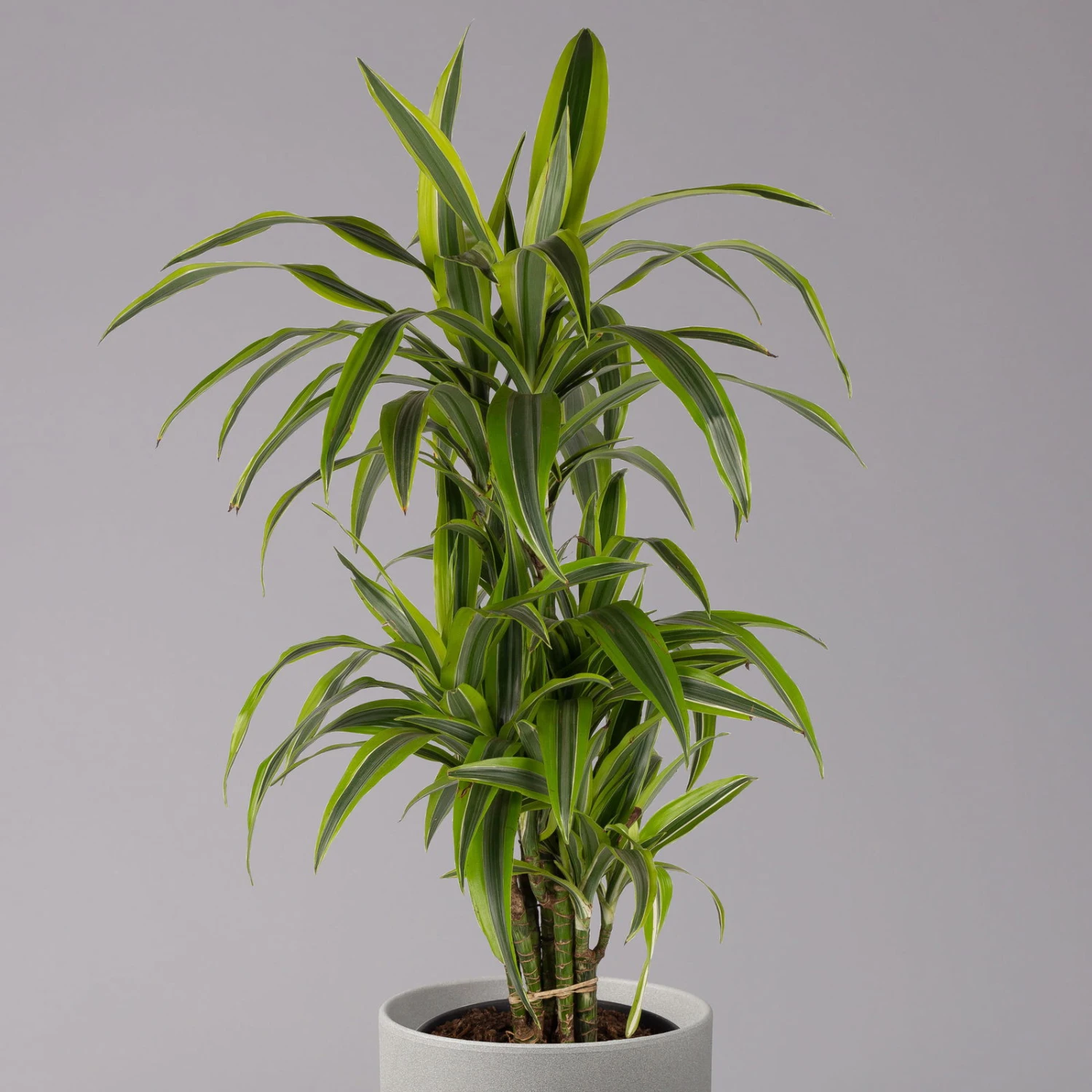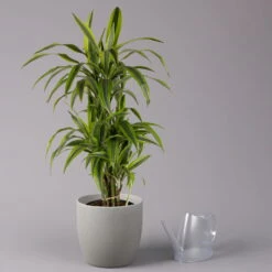 Die Dracaena fragrans ‚Lemon Lime‘ zeichnet sich durch einen verzweigten, buschigen Wuchs aus und gehört zu den Klassikern der modernen Raumbegrünung. Diese elegante Blattschmuckpflanze verbessert nachhaltig das Raumklima, da die Drachenbäume mehrere Schadstoffe wie Benzole oder Xylole der Luft entziehen. Daher ist die Dracaena fragrans ‚Lemon Lime‘ unter anderem für Raucherwohnungen, Küchen sowie fürs Büro immer die richtige Idee. Ihre Dracaena fühlt sich an einem hellen, jedoch absonnigen Standort wohl. Zwischen den Wassergaben dürfen Sie das Substrat gerne antrocknen lassen. Regelmäßige Sprühbäder mit kalkarmem und lauwarmem Wasser tun der Pflanze dagegen sehr gut.