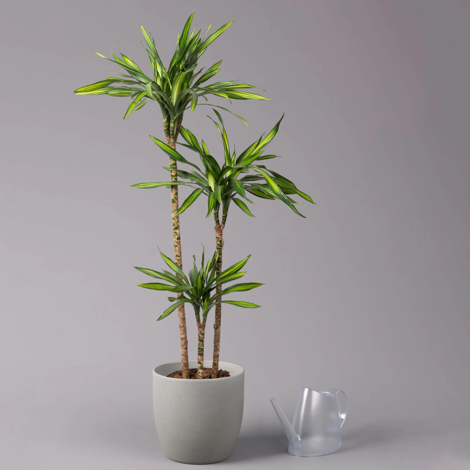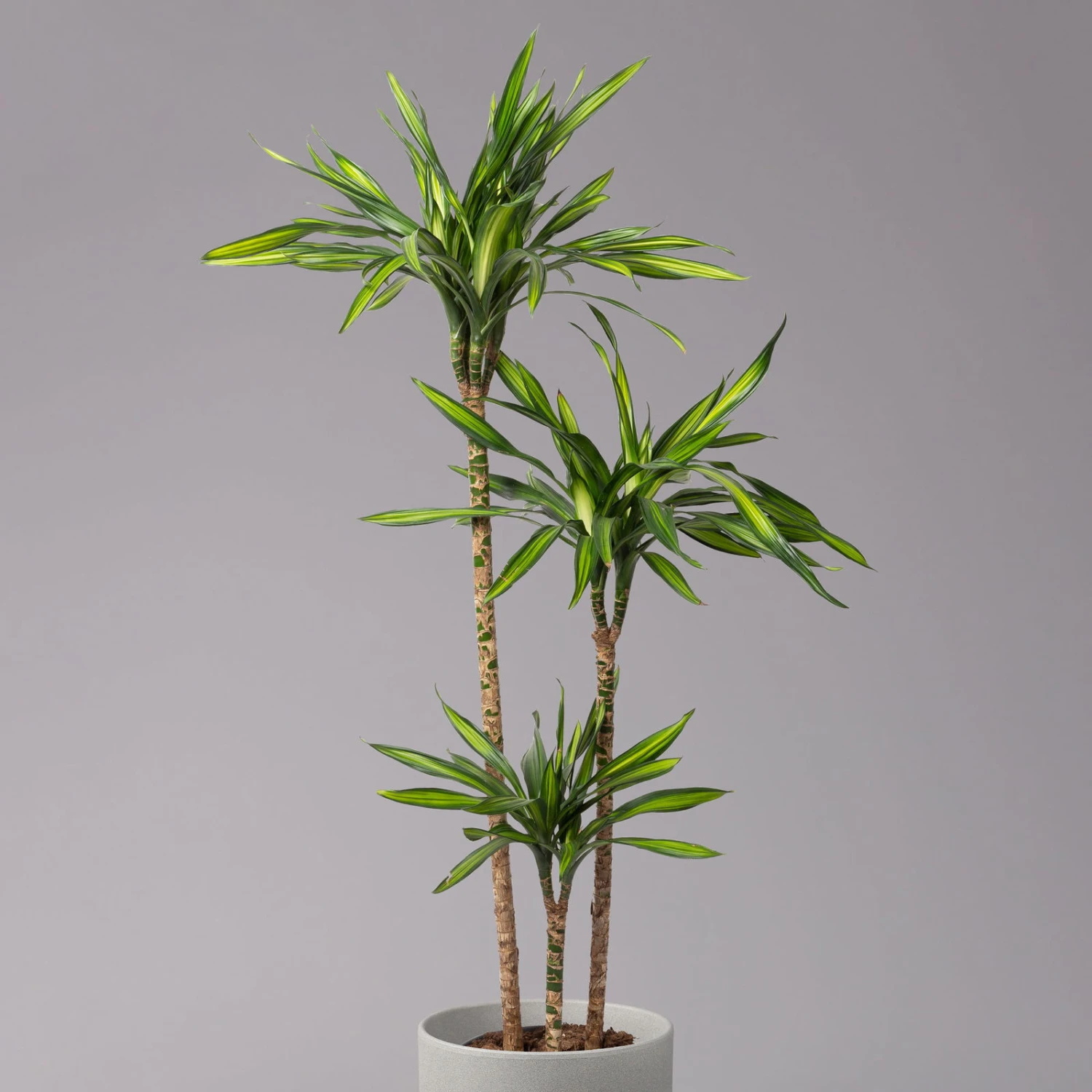 In einem 3er-Tuff mit unterschiedlich hohen Stämmen sieht die Dracaena ‚Riki‘ besonders dekorativ aus. Der Drachenbaum begeistert mit ihren lanzettförmigen Blättern und einer verspielten Kombination aus mehreren Grüntönen. Ein Drachenbaum eignet sich bestens zur Begrünung von Räumen mit belastetem Klima, denn diese ungewöhnliche Pflanze funktioniert wie ein effizienter Biofilter: Die Dracaena entzieht nämlich der Raumluft mehrere schädliche Substanzen, darunter Formaldehyde und Benzole. Das Spargelgewächs fühlt sich an hellen und warmen Standorten ohne direkte Sonne ganz wohl. Die Pflanze braucht nicht sonderlich viel Wasser und profitiert von moderaten Düngemittelgaben während der Vegetationsperiode.