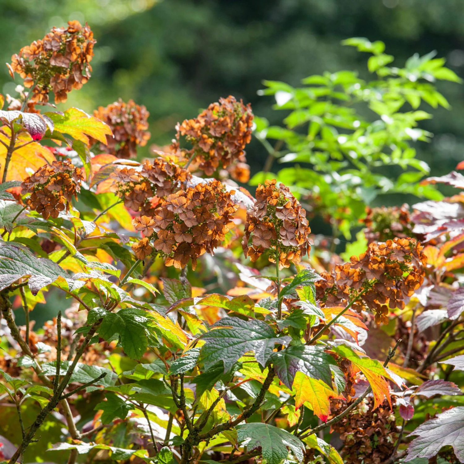 Bis zu 20 Zentimetern hoch erheben sich dekorative Blütenstände der Eichenblättrigen Hortensie ‚Ruby Slippers’®. Diese Eichblatthortensie überrascht zudem durch ihre verspielte Blätterform und einer stattlichen Wuchshöhe von bis zu 180 Zentimetern. Die Hydrangea quercifolia ‚Ruby Slippers’® fühlt sich an sonnigen bis halbschattigen Standorten besonders wohl und verträgt im Unterschied zu den meisten anderen Eichblatt-Hortensien leicht kalkhaltige Böden. Die Blütendolden enthalten auch zahlreiche fertile, nektarreiche Blüten, die gern von Bienen und anderen Insekten angeflogen werden. ‚Ruby Slippers’® ist eine der wenigen Eichblatthortensien deren Blüten sich im Abblühen rosa verfärben.