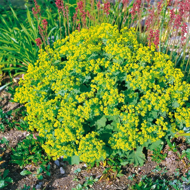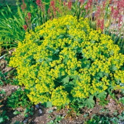 Graugrüne Blätter zieren die genügsame Pflanze und sammeln Regentropfen, die nach dem Regen wie glänzende Perlen auf der Blattoberseite tanzen. Die robuste Pflanze wächst sehr harmonisch und buschig, ohne dass Sie aufwendige Pflegemaßnahmen durchführen müssen. Für ein gutes Wachstum sollte auf einen ausreichend humosen Boden geachtet werden. Der als besonders robust geltende Frauenmantel kann sowohl einzeln als auch in Gruppen gepflanzt werden, bedeckt zügig den Untergrund und verhindert somit den Bewuchs von Wildkräutern.