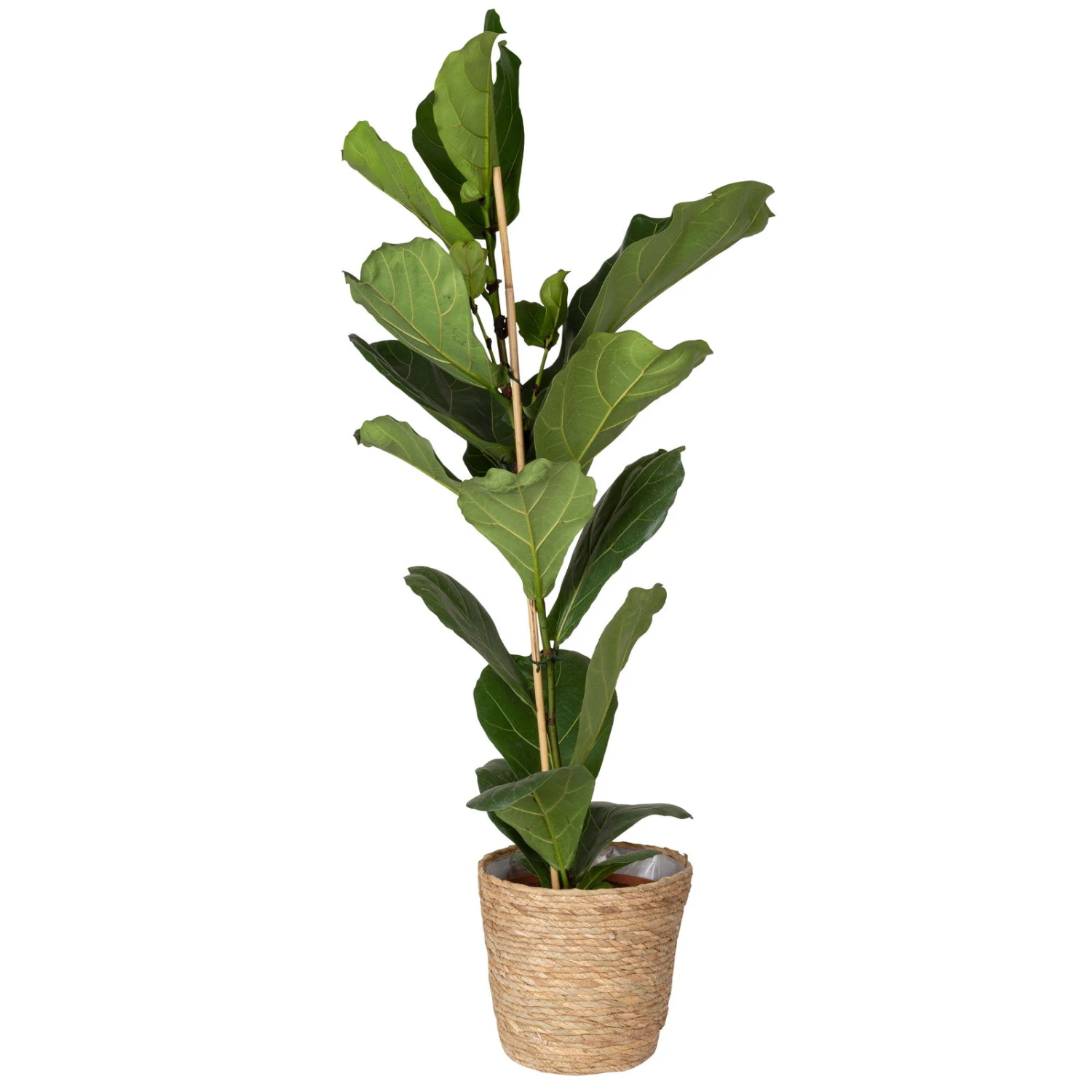 Die Geigenfeige (Ficus lyrata) ist eine imposante und pflegeleichte Zimmerpflanze mit formschönen bis zu 50 Zentimetern langen Blättern. Das Feigengewächs ist nicht nur eine Bereicherung für Ihr Begrünungskonzept, sondern auch ein natürlicher Luftfilter, der für ein besseres Raumklima sorgt. Suchen Sie für Ihre Geigenfeige einen hellen und vor direkter Sonne geschützten Standort aus. Je nach Wunsch können Sie den Ficus lyrata entweder in herkömmlicher Pflanzenerde oder in Hydrokultur pflegen. Diese Zierpflanze legt einen moderaten Wasserbedarf an den Tag. Staunässe und Trockenheit sind unbedingt zu vermeiden. Bedenken Sie, dass die Pflanze einen giftigen Milchsaft enthält. Die Geigenfeige erhalten Sie inklusive dem Seegraskorb ‚Osaka‘ mit innenliegendem Folieneinsatz.