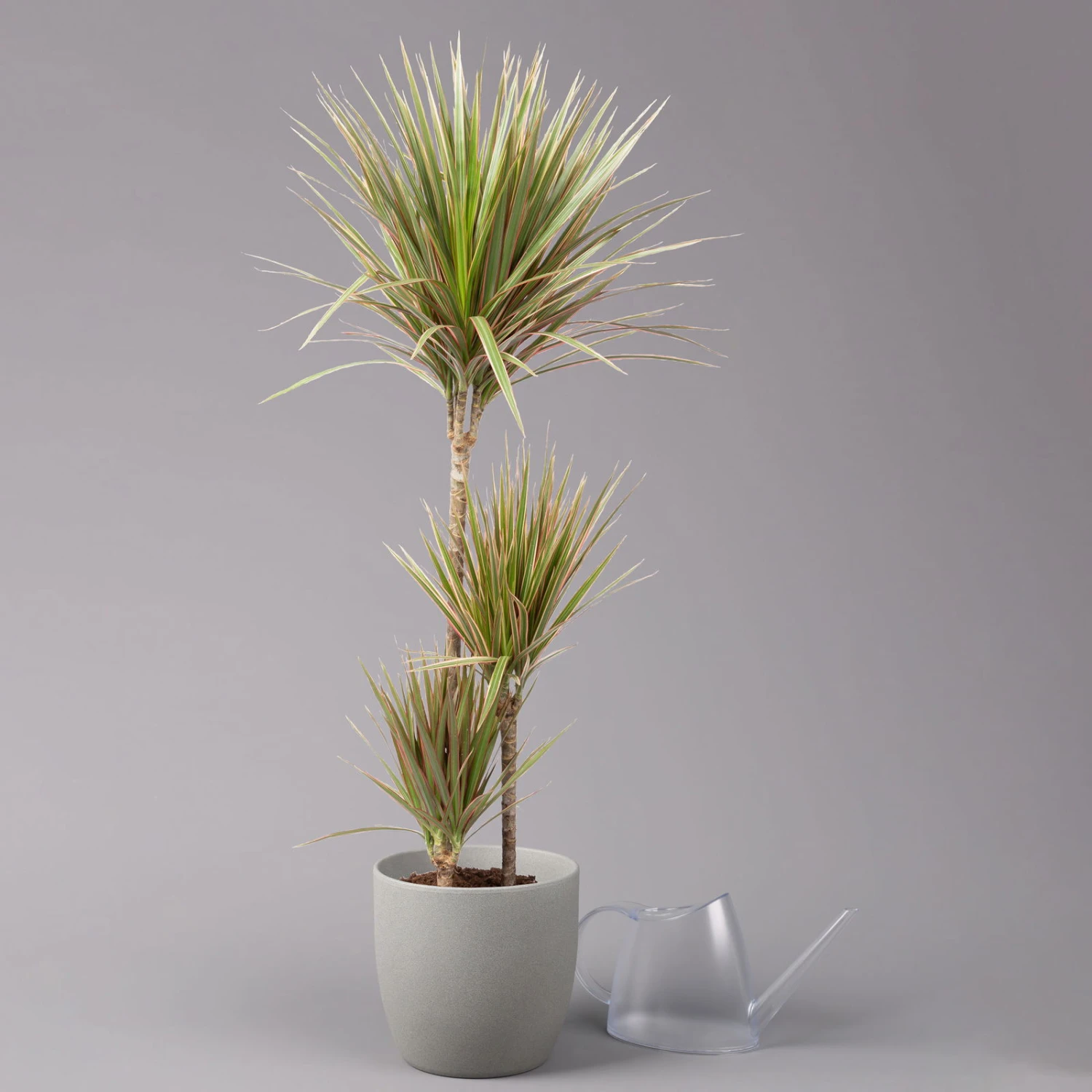 Die schmalen, lanzettlichen Blätter dieses Drachenbaumes tragen eine effektvolle Streifenzeichnung in Rot, Grün und Weiß. Die Dracaena marginata ‚Bicolor‘ erhalten Sie in einem liebevoll gestalteten 3er-Tuff mit unterschiedlich hohen Stämmen. Diese Zimmerpflanze lässt sich in einem Büro, Wohnzimmer oder in einer Küche gekonnt in Szene setzen, ob als exotisches Highlight oder als stimmiges Element Ihres tropischen Begrünungskonzepts. In einem Raum mit Dracaena profitieren Sie von der verbesserten Luftqualität, da die Drachenbäume mehrere Schadstoffe binden. Vorteilhaft sind außerdem die geringen Ansprüche der Dracaena ‚Bicolor‘ an die Pflege, denn dieses Spargelgewächs verzeiht Ihnen gerne ein paar Anfängerfehler. Wenn Sie für Ihren Drachenbaum einen hellen oder halbschattigen Standort aussuchen, die Pflanze nur in beheizbaren Räumen pflegen sowie sich beim Gießen sparsam zeigen, bedankt sich die Dracaena mit einem formschönen Wuchs und mit langer Lebensdauer.