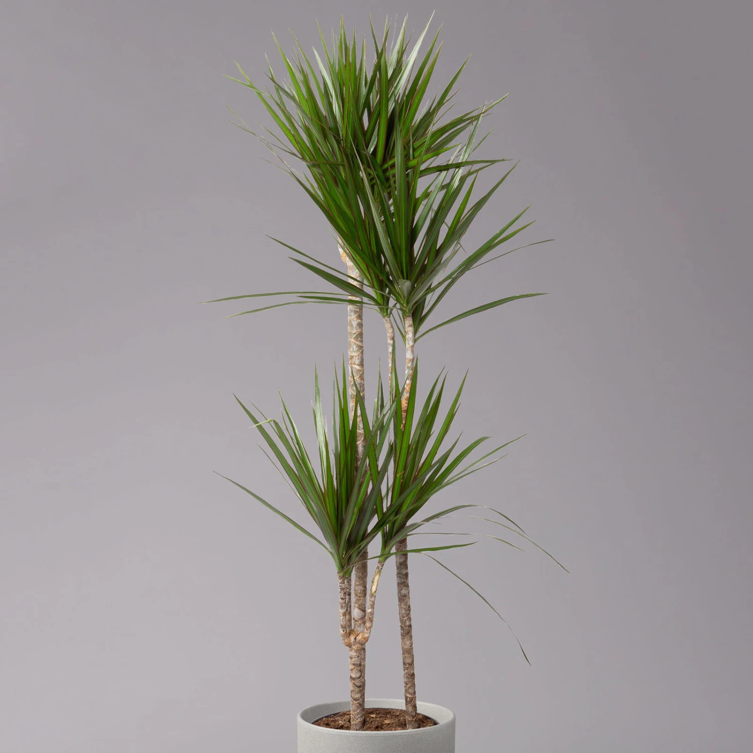 Sie erhalten die beliebte Dracaena marginata für eine besonders abwechslungsreiche Optik in einem 3er-Tuff. Ob als immergrüner Solitär oder stimmiges Element Ihres durchdachten Begrünungskonzepts – eine Dracaena macht sowohl im Büro als auch in privaten Räumen eine gute Figur. Dabei ist Ihr Drachenbaum nicht nur eine dekorative Zimmerpflanze, sondern auch ein natürlicher Luftraumfilter und zuverlässiger Sauerstofflieferant. Vor allem in Räumen mit belasteter Luft wie Küchen und Büros, Cafés oder Raucherwohnungen sorgt die Dracaena marginata für eine Wohlfühlatmosphäre. Als vorteilhaft erweist sich der geringe Pflegeaufwand, denn ein Drachenbaum braucht relativ wenig Wasser und gedeiht in hellen oder halbschattigen Lagen gleich gut.