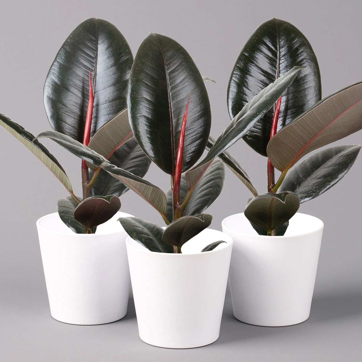 Der Ficus elastica ‚Robusta‘ begeistert mit großen, ledrigen Blättern und gilt als besonders widerstandsfähig. Der anspruchslose Gummibaum, so der deutsche Name dieser Trendpflanze, lässt sich mit gleichem Erfolg zur Begrünung von Büros, Arztpraxen oder Wohnräumen einsetzen. Ein Ficus ist eine richtige Wohlfühlpflanze, da dieses Tropengewächs der Luft unterschiedliche Schadstoffe entzieht und somit für ein besseres Raumklima sorgt. An den Standort stellt der Ficus elastica ‚Robusta‘ keine allzu hohen Ansprüche, denn der Gummibaum gibt sich sowohl mit hellen als auch mit halbschattigen Lagen durchaus zufrieden. Problematisch können neben einem Überfluss an direkter Sonne noch Zugluft und Staunässe sein. Auf Wunsch dürfen Sie Ihren Ficus gerne in der warmen Jahreszeit an einem windgeschützten Standort im Freien pflegen. Bitte beachten Sie, dass der Milchsaft des Gummibaumes giftig ist.