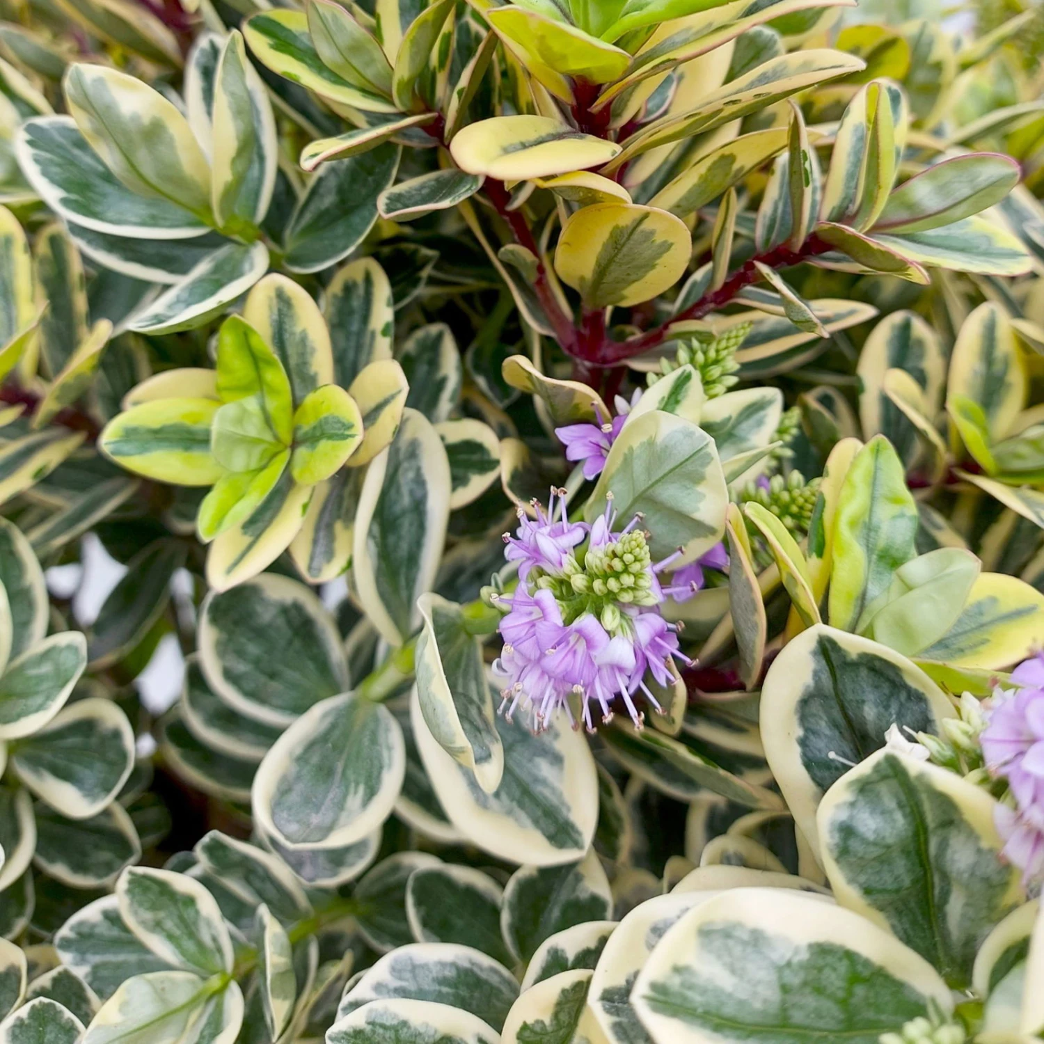 Die großen, buntlaubigen, lang gestreckten Blätter der Strauchveronika (Hebe andersonii Addenda®) überzeugen in verschiedenen Grüntönen. Die Pflanze wächst aufrecht und buschig. Die Strauchveronika kann eine Wuchshöhe von 40 bis 60 cm erreichen und auch entsprechend breit werden.