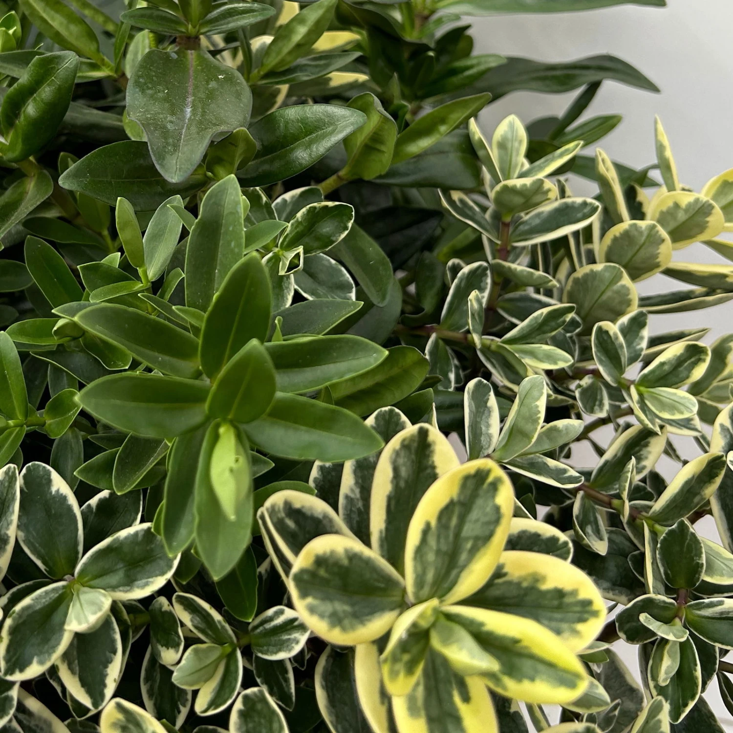 Die großen, lang gestreckten Blätter der Strauchveronika (Hebe andersonii Addenda® ‚Trio‘) überzeugen in einer Mischung aus sattem Grün und zweifarbig panaschiert. Die Pflanze wächst aufrecht und buschig. Die Strauchveronika kann eine Wuchshöhe von 40 bis 60 cm erreichen und auch entsprechend breit werden. Der Farbton-Mix des Laubes wird nach Verfügbarkeit geliefert.