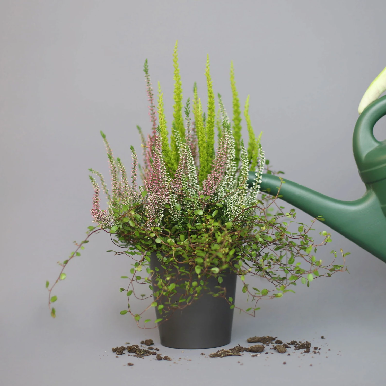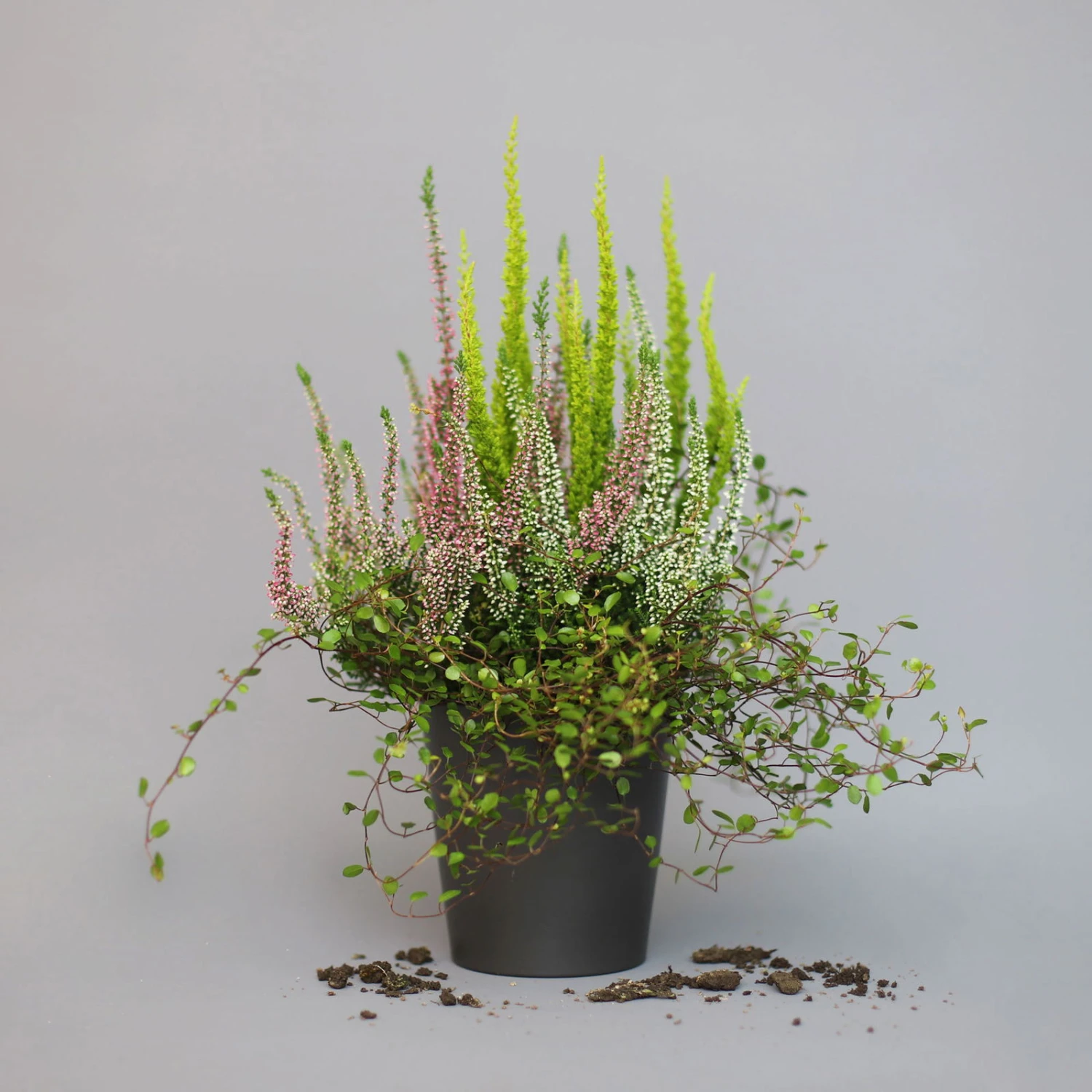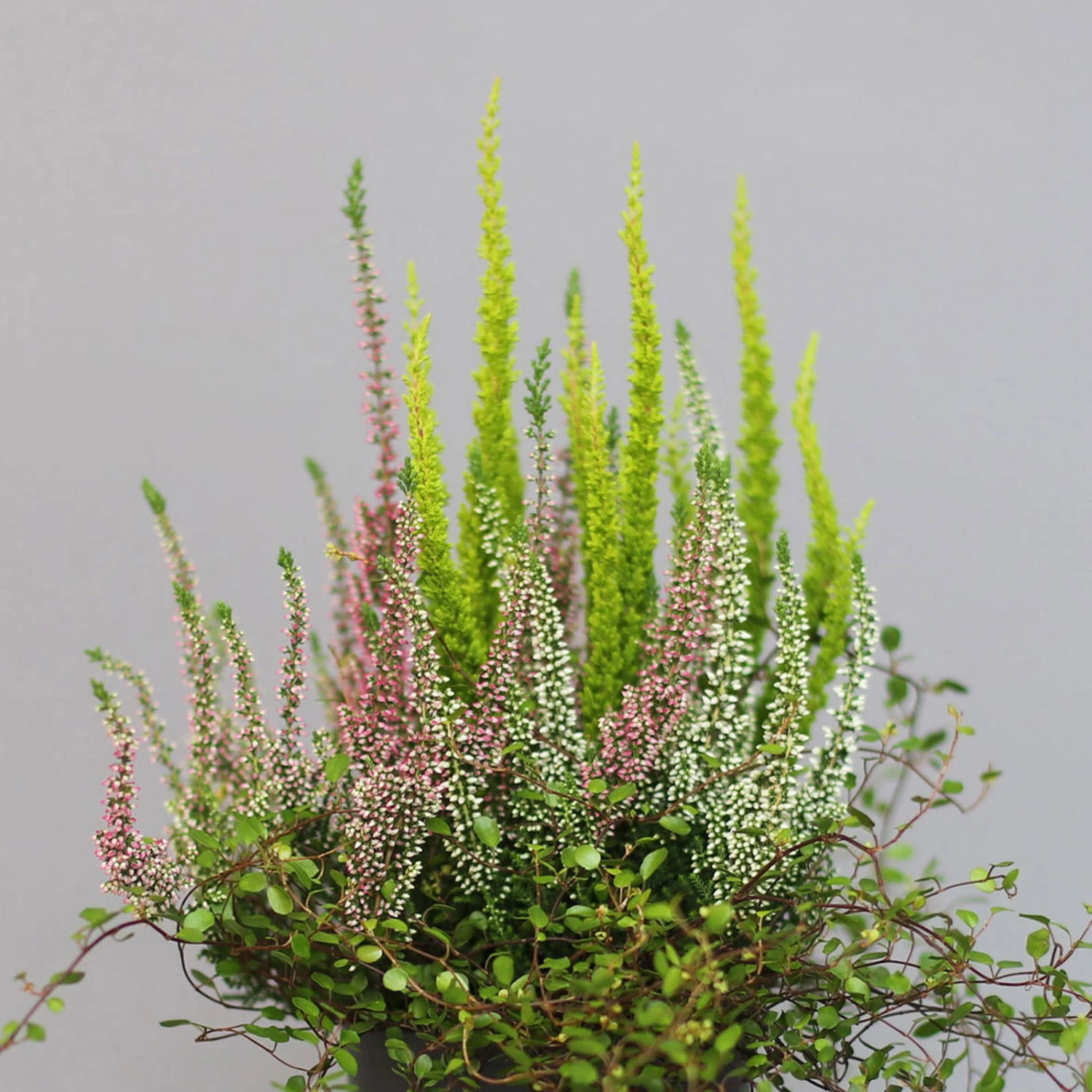 Der Mix aus Knospenheide (Calluna vulgaris), Mühlenbeckie (Mühlenbeckia axillaris) und Baumheide (Erica arborea) bilden mit ihren unterschiedlich aussehenden Blättern eine abwechslungsreiche und herbstliche Einheit. Die Blätter der Mühlenbeckia sind rund, glatt und sattgrün und wachsen an drahtigen, kriechenden Zweigen. Die der Baumheide sind nadelartig und die Blätter der Calluna liegen schuppenförmig am Zweig an. Das gepflanzte Trio wächst buschig und aufrecht, abgesehen von der Mühlenbeckia, die mit leicht überhängendem Wuchs über Töpfe rankt. Die Baumheide ist die größte Pflanze in diesem Heidepflanzen Mix und kann eine Wuchshöhe von bis zu 100 cm erreichen und auch bis zu 60 cm breit werden.