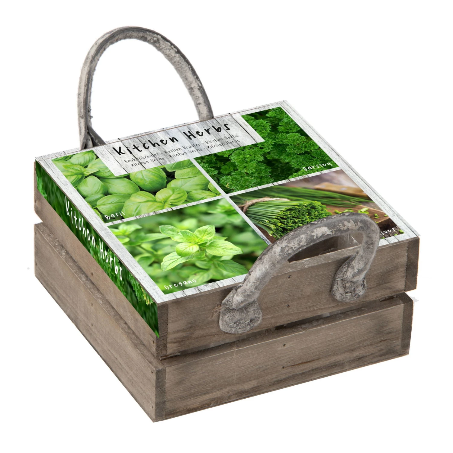 Sie erhalten vier beliebte Küchen- und Gewürzkräuter in dekorativen Kisten, um Ihren Speisen eine aromatisch-würzige Note zu verliehen. Anzuchterde, Saatgut und eine Schritt-für-Schritt-Anleitung sind inklusive. Das Set ist sorgfältig verarbeitet und die Küchenkräuter lassen sich über einen längeren Zeitraum ernten. Ein Nachschub an frischen Gewürzen ist somit immer zur Hand.