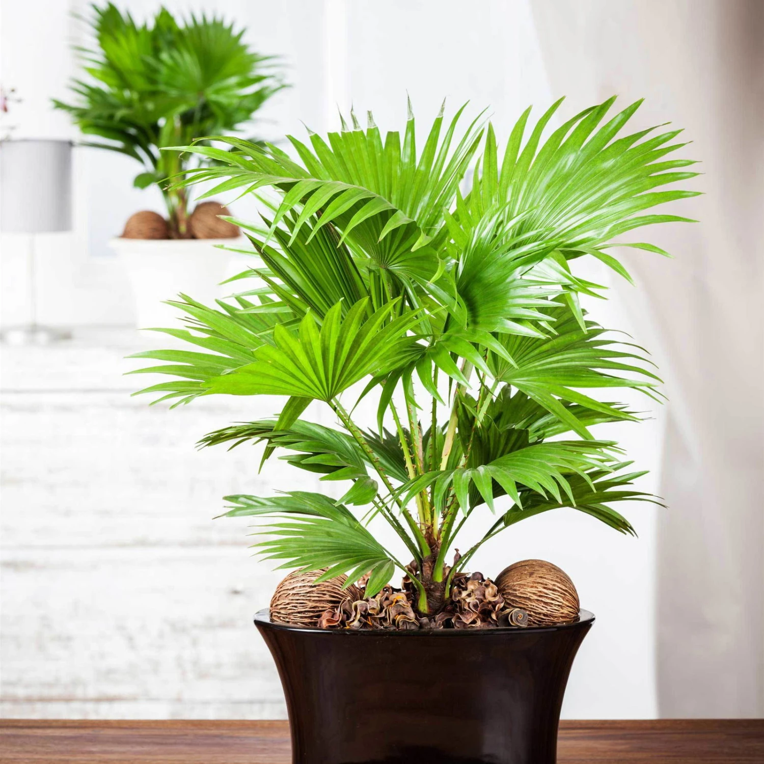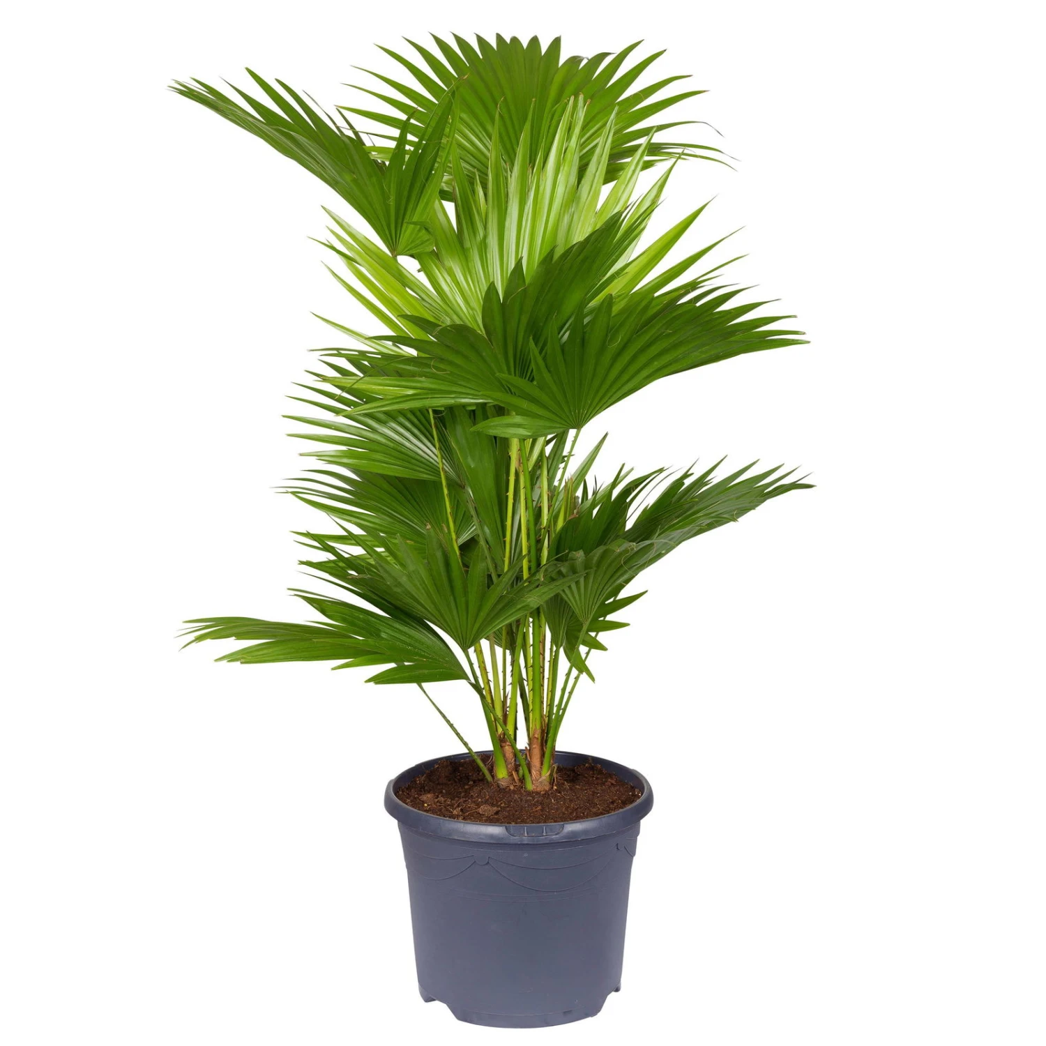 Die ‚Livistona rotundifolia‘ ist eine imposante Schirmpalme mit effektvollen, ausladenden Wedeln. Die Livistonia wächst bei relativ kühlen Temperaturen langsam und beschleunigt in der Wärme ihr Wachstumstempo. Sorgen Sie jedoch bitte dafür, dass die Lufttemperaturen am Standort Ihrer Palme nicht unter 20 Grad Celsius sinken. Die ‚Livistona rotundifolia‘ entwickelt sich in hellen Lagen ohne viel direkte Sonne am besten. Im Sommer profitiert die Schirmpalme von einem Urlaub im Freien, dabei soll der Standort ebenfalls nicht zu sonnig und gerne windgeschützt sein. Wählen Sie für Ihre Livistonia ein durchlässiges Substrat, optimal wäre eine spezielle Palmenerde. Beim Wässern dürfen Sie sich gerne etwas sparsamer zeigen, ohne dass der Wurzelballen austrocknet. Besprühen Sie die fächerförmigen Blätter mit kalkfreiem Wasser, damit das Palmengewächs gedeiht.