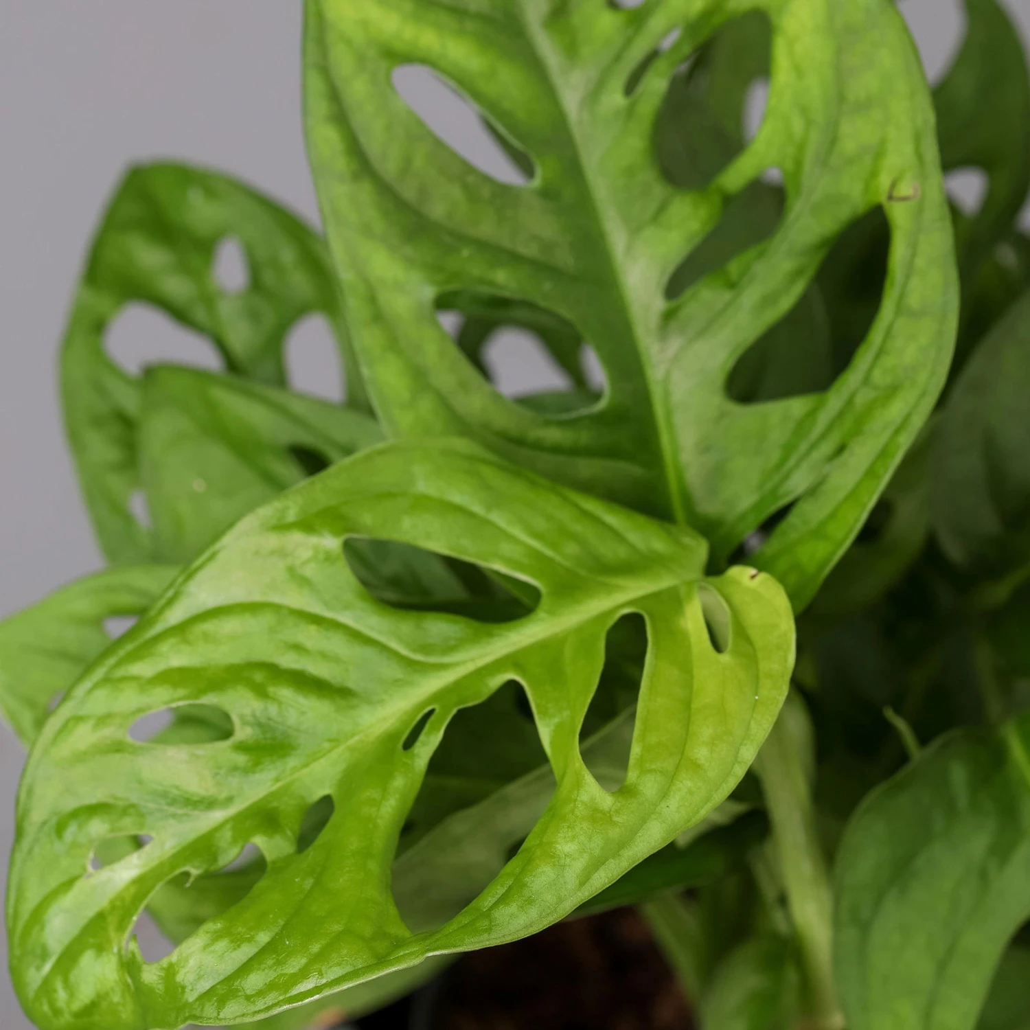 Das Schiefe Fensterblatt (Monstera adansonii) gilt als absolute Trendpflanze und bietet mit seiner außergewöhnlichen Optik die optimale Grundlage für echtes Dschungelfeeling in Ihrem Zuhause. Charakteristisch sind die elliptischen, zugespitzten Blätter, welche von mehreren Durchbrüchen durchzogen sind. Das verleiht der Pflanze ihr löchriges Aussehen und ihren Beinamen ‚Swiss Cheese Plant‘ (zu deutsch: ‚Schweizer Käse-Pflanze‘). Die Blätter sind kräftig grün uns sitzen an langen Stielen. Die Monstera ist eine Kletter- und Rankpflanze und bildet Luftwurzeln aus, mit denen sie sich in der Natur an Felsen und Baumstämmen emporrankt. Bei der Zimmerkultur kann der Pflanze eine Rankhilfe in Form eines Moosstabs zur Verfügung gestellt werden. Ohne Rankhilfe wächst das Fensterblatt überhängend und kann auch in einer Blumenampel kultiviert werden. Kletternd kann die Pflanze Höhen von bis zu 3 Metern erreichen.