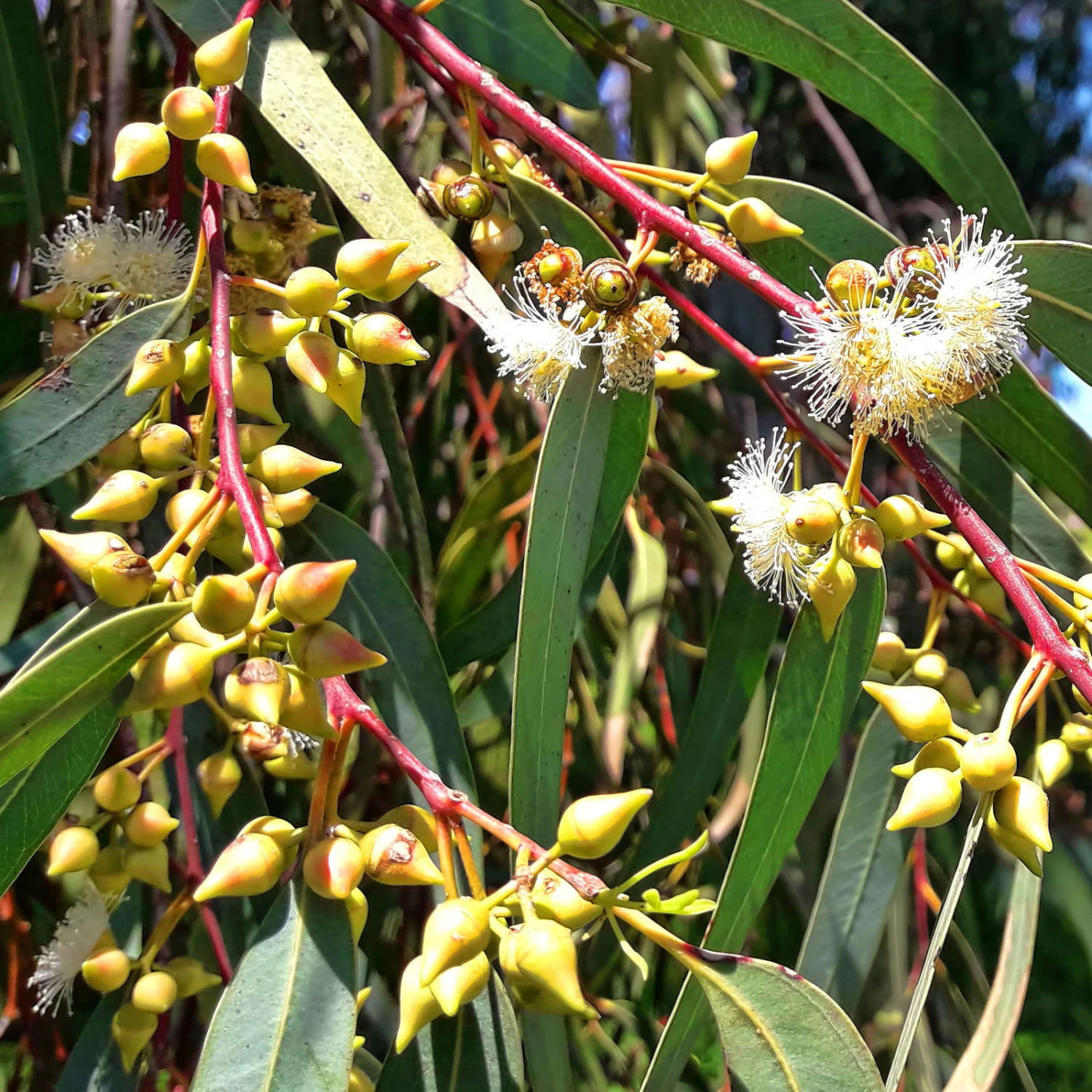 Da der rote Eukalyptus von der Südhalbkugel stammt, liegt die Blütezeit in unseren Wintermonaten. Die Blüten sind weiß mit kleinen Dolden auf rundlich langen Stielen, mit gelbweißen Staubgefäßen. Der Eukalyptus blüht bei uns aber nicht zuverlässig, so dass die Hauptattraktion die filigranen Blätter und die rote Rinde sind.