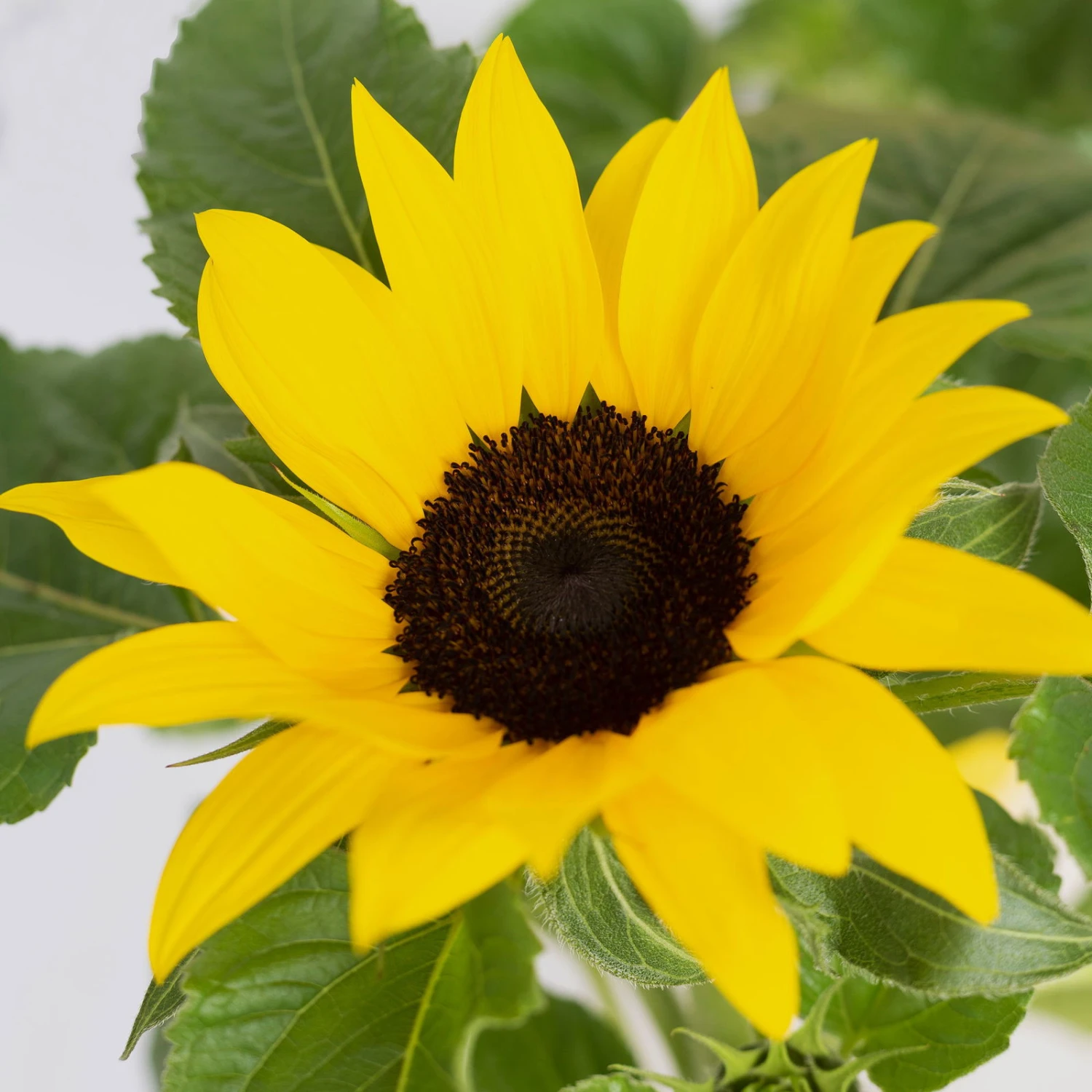 Die etwas rauen, annähernd herzförmigen Blätter der Sonnenblume (Helianthus annuus ‚Sunsation’®) überzeugen mit einem leicht matten Grün. Die Sonnenblume ‚Sunsation’® wächst aufrecht und ist vom Gärtner extra klein gehalten worden, sodass sie sich gut für den Topf eignet. Die einjährige, krautige Pflanze kann eine Wuchshöhe von ca. 50 cm erreichen.