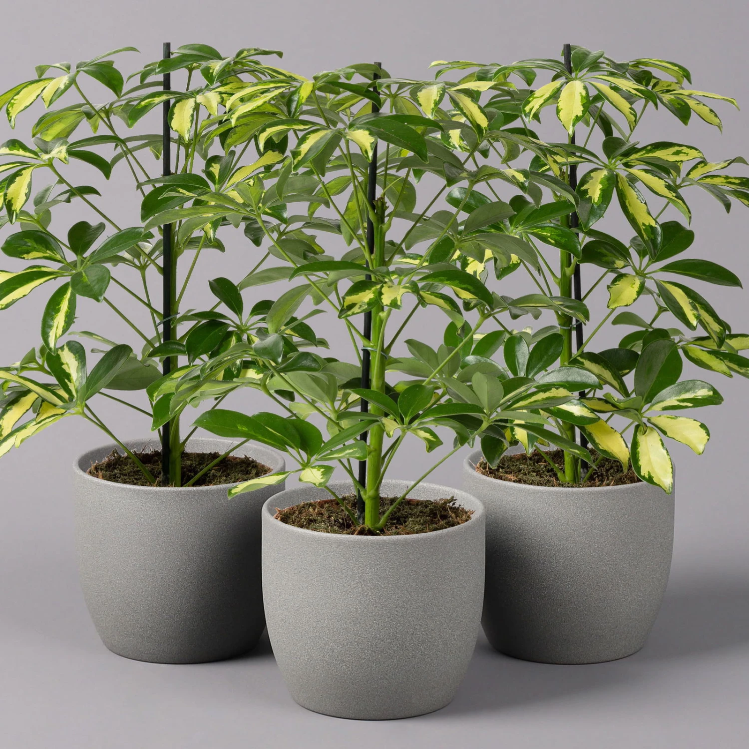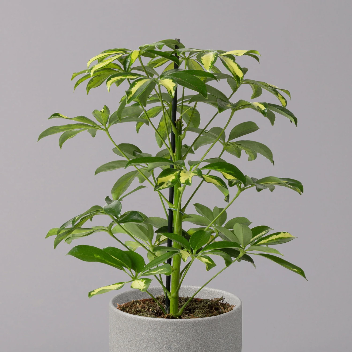Die Strahlenaralie (Schefflera arboricola) zählt zu den beliebtesten Büropflanzen, da sie sehr robust und besonders schnellwüchsig ist. Die ursprünglich aus Taiwan stammende Tropenpflanze besticht mit den typisch strahlenförmig angeordneten Blättern, die kräftig grün und glänzend sind. Die Pflanze wächst schlank aufrecht und kann bis zu 2 Meter hoch werden. Ab einer gewissen Höhe bietet sich ein Moosstab als zusätzliche Fixierung an, welcher der Pflanze als Stütze dient.