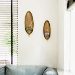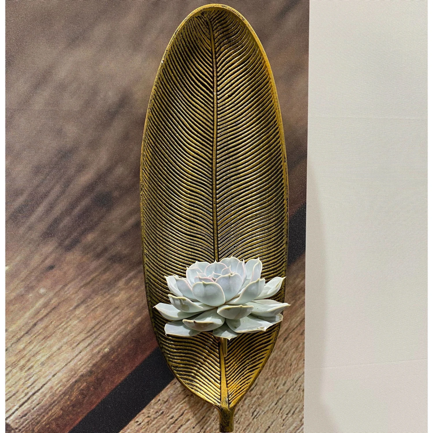 Dieses aparte Werkstück besteht aus einem goldfarbenen, holzartigen Wandelement in Blattform an dem der mitgelieferte Metallteller angebracht wird. Auf diesem Metallteller können Sie die in einer separaten Box mitgelieferte Schnittecheverie platzieren. Die Echeverie ist eine Sukkulente, die auch als Schnittware mit monatelanger Haltbarkeit überzeugt und weder Wasser noch Licht braucht. Verwelkte Blätter können einfach abgezupft werden. Das Werkstück lässt sich wunderbar mit vielen Einrichtungsstilen kombinieren und wertet Ihr Zuhause mit modernen Akzenten auf. Nach dem Verwelken der Pflanze können Sie diese entweder spielend einfach gegen eine frische Schnitt-Sukkulente austauschen oder auf dem Metallteller z.B. eine LED-Kerze präsentieren.