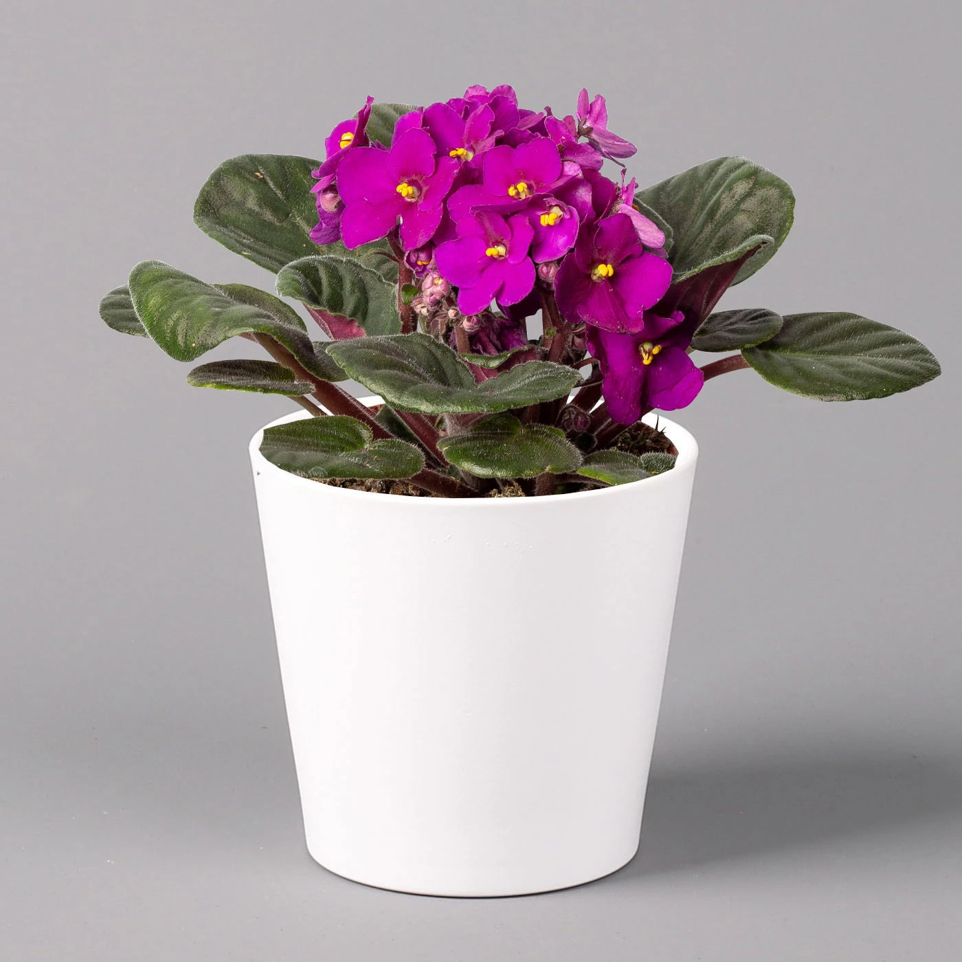 Das Usambaraveilchen (Saintpaulia ionantha-Hybriden) ist eine zarte Blühpflanze mit prächtigen Blüten, die ursprünglich aus Afrika stammt und sich bei uns in der Zimmerkultur besonderer Beliebtheit erfreut. Charakteristisch sind die rundlichen, fleischigen Blätter, die mit einem feinen Flaum überzogen sind, was ihnen ihr samtiges Äußeres verleiht. Das Usambaraveilchen wächst gedrungen und krautig ausdauernd und bildet eine Blattrosette aus. Die Pflanze erreicht eine Höhe von bis zu 15 cm.